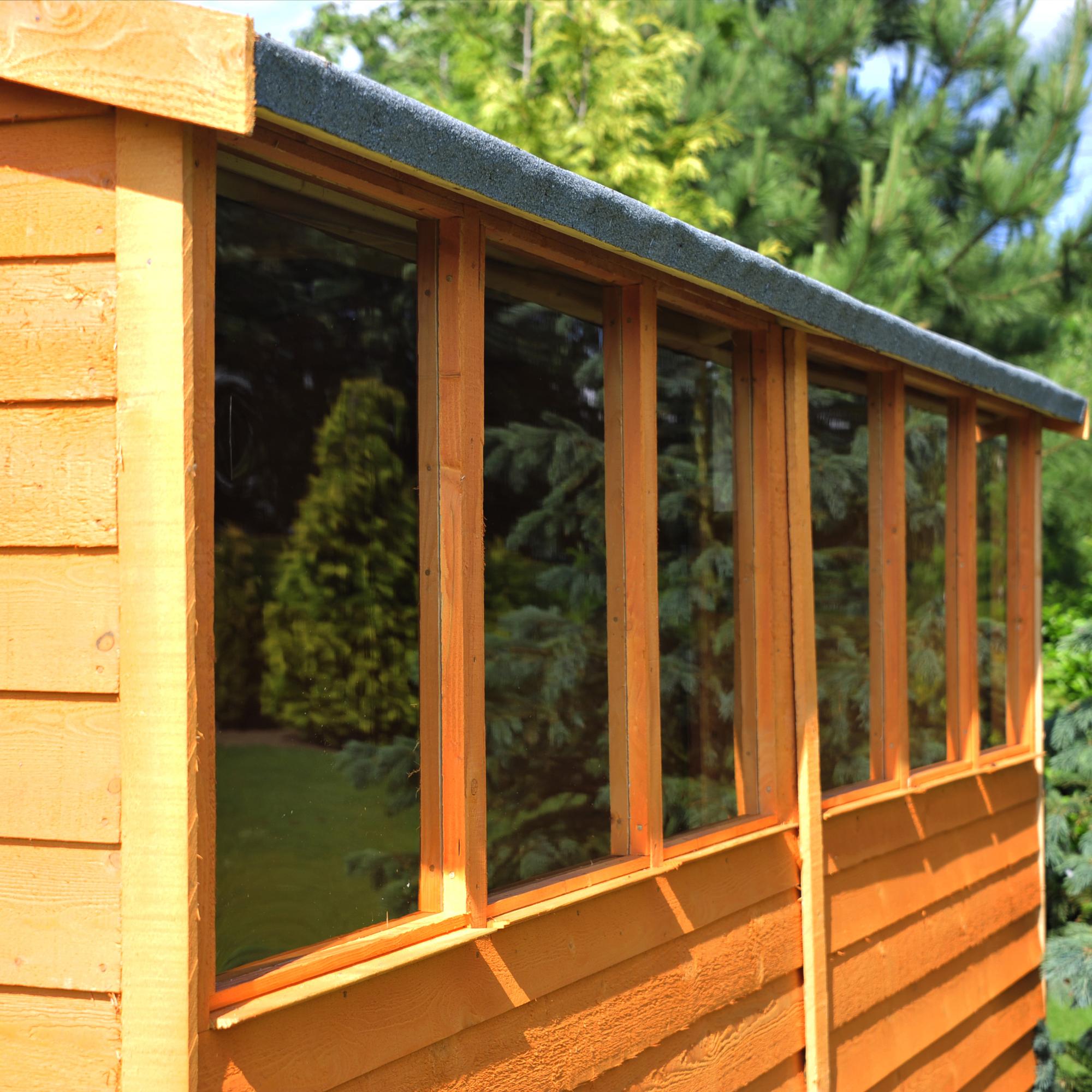 The 10′ x 6′ double door, overlap apex shed is an attractive feature in any garden. Windows down one side provide plenty of light and have safety glazing. Windows can be fitted on either side and are non-opening. The double doors in the 6′ Gable and generous eaves height allow very easy access to the entire space. It is manufactured from high grade, slow grown, FSC approved, European pine cladding boards over 34mm square framing. The doors are fitted with a hasp and staple catch ready for your own padlock. Both roof and floor are constructed from solid sheet OSB. The building is dip treated with a basecoat ready for top coating by the customer immediately on installation. All fixings, roof felt and assembly instructions are provided. (Imperial dimensions are approximate to the nearest foot, please refer to the exact metric dimensions given)