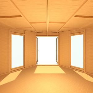 The Barclay is a magnificent summer house designed to fill a corner of your garden. With its full height, styrene safety glazed windows and doors, this summerhouse lets in lots of light and is a delight to spend your time in. Wall panels are made from 12mm shiplap boards and supplied in a honey brown timber basecoat ready for you to topcoat. It is manufactured from high quality FSC certified northern European pine. The floor is tongued and grooved timber and the roof is solid sheet OSB; mineral felt is included. Allowance should be made for the roof overhang and access for painting and during installation. Imperial dimensions are rounded and for guidance only.