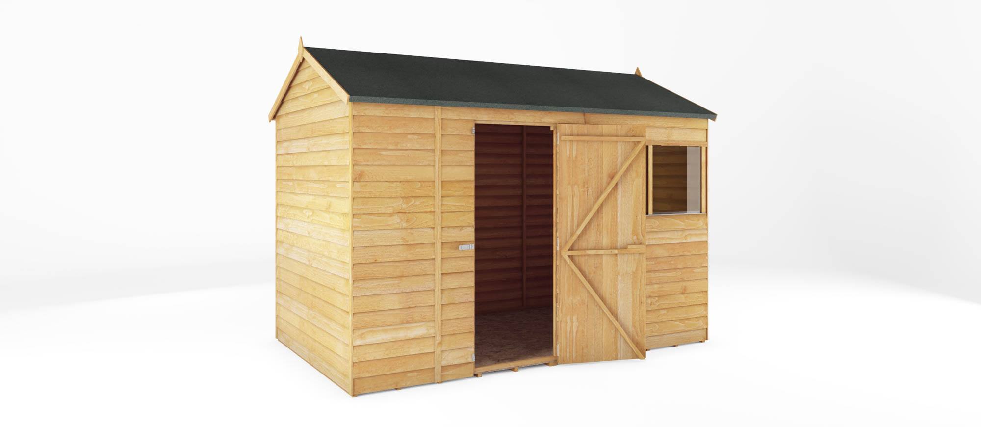Our 10 x 6 Reverse Apex Overlap Wooden Shed is a spacious garden building designed to offer secure and durable outdoor storage. The large interior is ideal for storing bikes, wheel barrows and lawn mowers, as well as gardening tools and equipment. Featuring a shatterproof styrene glazed window to the front, this building fills with light, making it easy to locate your items. The single door has been braced with internal ledging, and a pad bolt is included for security.