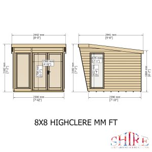 The contemporary Highclere Summerhouse is a stunning design updating the traditional summerhouse into a modern garden room. The high quality double doors open out to the front with a small canopy over and there are large opening side windows. The windows and doors are fitted with styrene safety glazing and are joinery made in a storm resistant design. The doors are also fitted with a mortice lock. The building is constructed on strong 34mm square framing and clad with planed shiplap tongue and groove boards made only from the highest grade, slow grown, FSC approved, northern European pine. The roof is 12mm plywood sheet with mineral roof felt supplied to complete the exterior. The summerhouse is supplied with a dip treated base coat preservative ready for you to top coat to your choice immediately on installation; this could be a paint or a stain. (Imperial dimensions are approximate to the nearest foot; please refer to the exact metric dimensions in the data given) Allowance should be made for the roof overhang and access for painting and during installation.