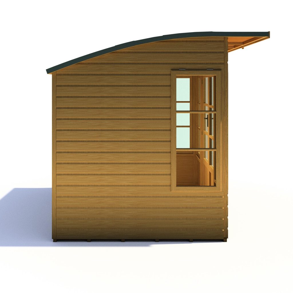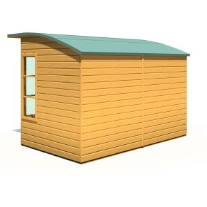 The stunning, handmade Orchid Summerhouse design really stands out from other summerhouses! Its signature curved roof has many advantages both shedding rainwater effectively but also gives an unobtrusive roof line. With a eaves height of 5’10 and lofty 7′ height at the front, the Orchid also provides a comfortable space. This garden room is perfect for reading, dining or relaxing! The high quality double doors, fitted with a mortice lock, open out to the front with a small canopy over. There are two opening and two fixed windows (1235 mm H x 507 mm W) glazed with styrene safety glazing.