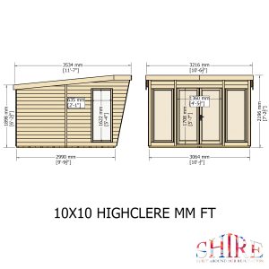The contemporary Highclere Summerhouse is a stunning design updating the traditional summerhouse into a modern garden room. The high quality double doors open out to the front with a small canopy over and there are large opening side windows. The windows and doors are fitted with plastic safety glazing and are joinery made in a storm resistant design. The doors are also fitted with a mortice lock. The building is constructed on strong 44mm square framing and clad with planed shiplap tongue and groove boards made only from the highest grade, slow grown, FSC approved, northern European pine. The summerhouse is supplied with a dip treated base coat preservative ready for you to top coat to your choice immediately on installation; this could be a paint or a stain. (Imperial dimensions are approximate to the nearest foot; please refer to the exact metric dimensions in the data given) Allowance should be made for the roof overhang and access for painting and during installation.