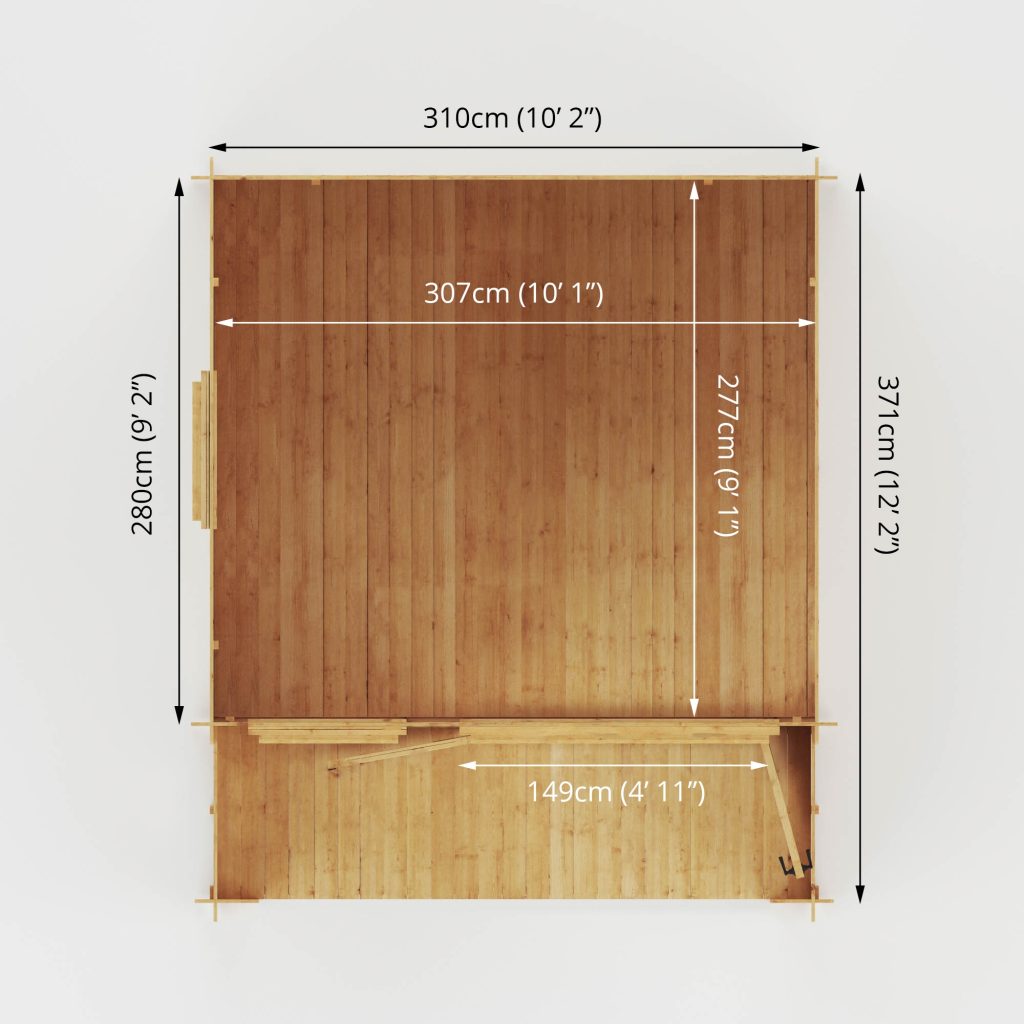 The 3.3m x 3.7m Log Cabin with Veranda is the perfect way to maximise your living space at home. A combination of traditional features and a contemporary open plan living space create the perfect garden getaway. Ideal for entertaining family and friends or simply somewhere to relax and unwind. The building is open and spacious with two large, opening windows that allow natural light to flood the interior, to create a bright and airy space to enjoy. Elegant half glazed French doors open out onto a stylish veranda, which offers the perfect spot to enjoy the summer weather while under the shade of the roof overhang. We use high strength SAN styrene to glaze the windows and doors of this cabin, a strong, safe and shatterproof alternative to glass.