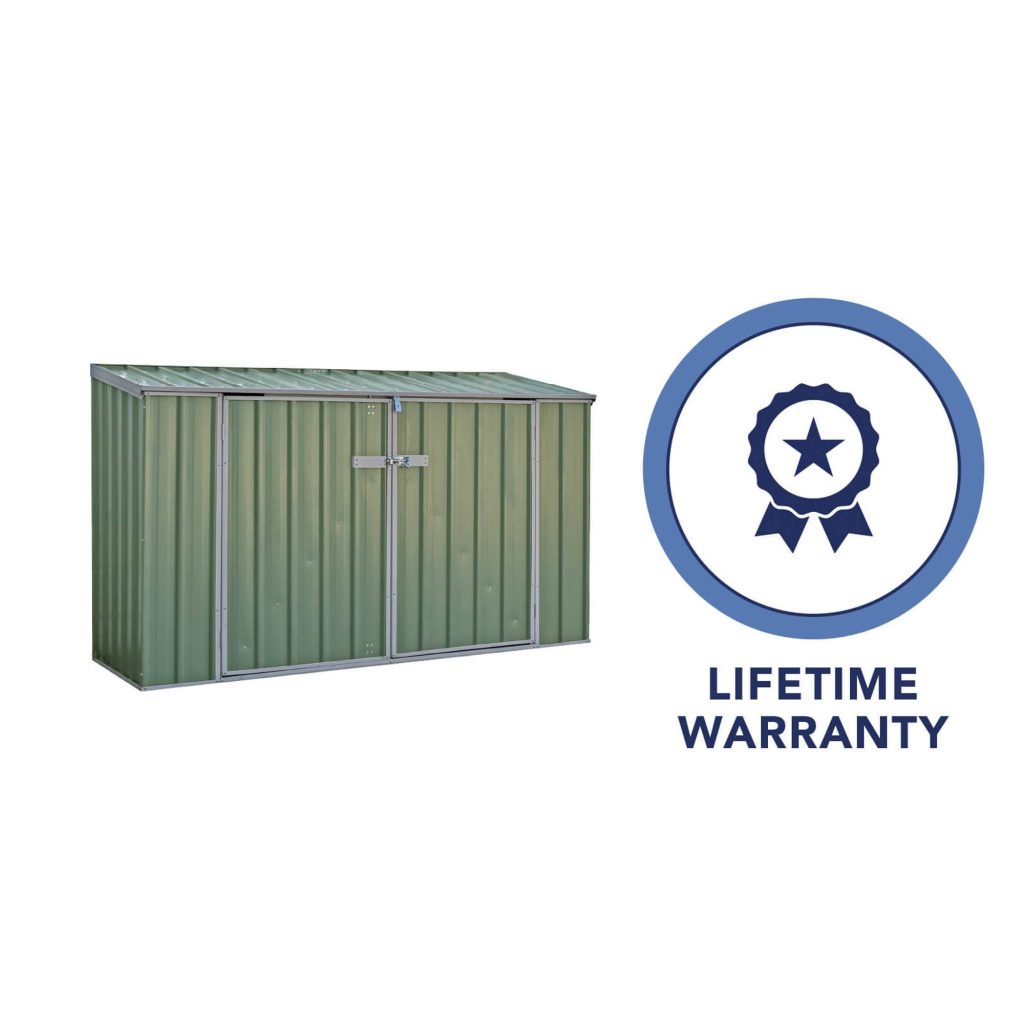 The Absco 7 x 3 Bike Store offers an optimal storage solution for bicycles and smaller outdoor gear. With its doubled hinged doors and skillion roof, accessing your belongings is effortless. Its compact size is perfect for areas where space is limited. Crafted in Australia from preassembled metal panels using the innovative Snap-Tite construction system, assembly is quick and straightforward.