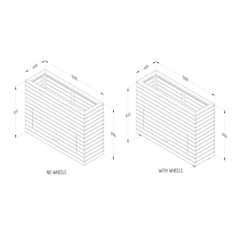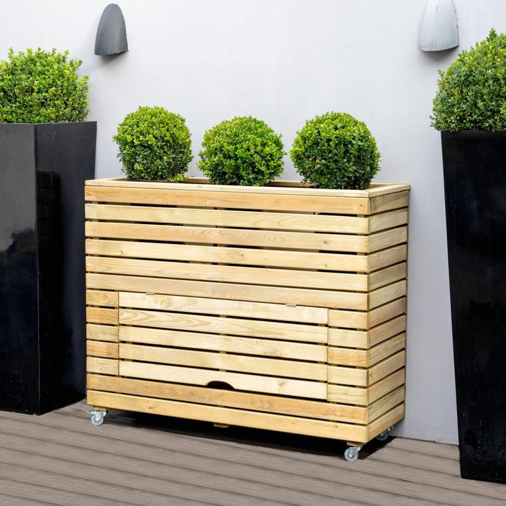 - A modern garden planter which is both stylish and practical. The Tall Linear Planter with Storage from Forest Garden is a contemporary garden planter with a useful storage area. Its long lines and tall profile will be ideal as part of a modern garden design. The integral compartment is an ideal tool storage area for keeping secateurs, watering cans, and other frequently used garden tools. Conveniently designed with wheels.