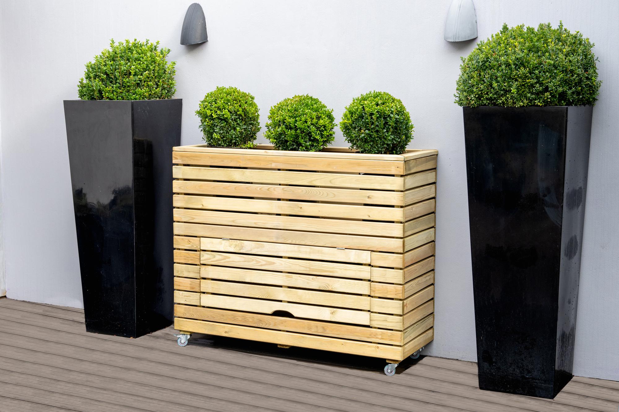 - A modern garden planter which is both stylish and practical. The Tall Linear Planter with Storage from Forest Garden is a contemporary garden planter with a useful storage area. Its long lines and tall profile will be ideal as part of a modern garden design. The integral compartment is an ideal tool storage area for keeping secateurs, watering cans, and other frequently used garden tools. Conveniently designed with wheels.