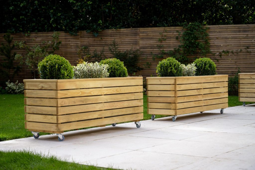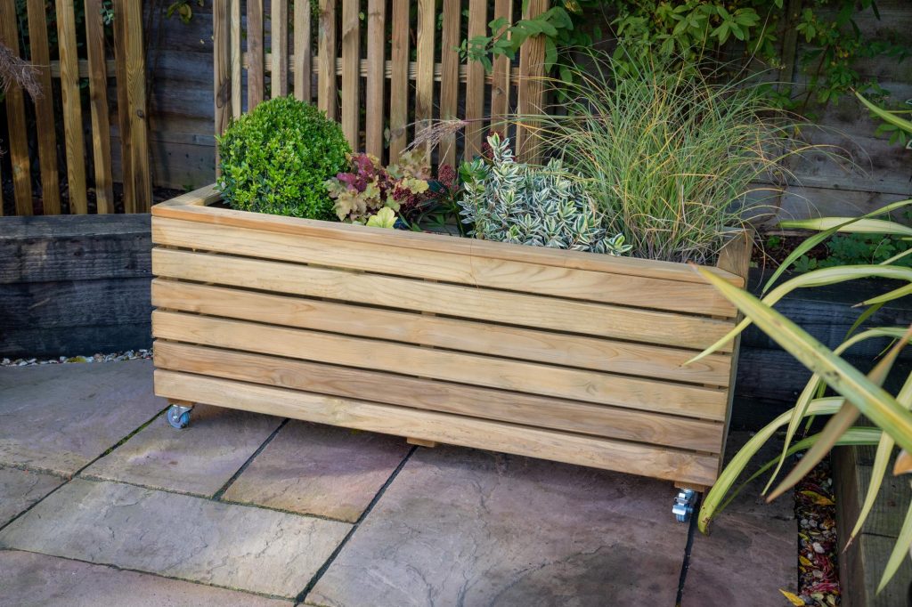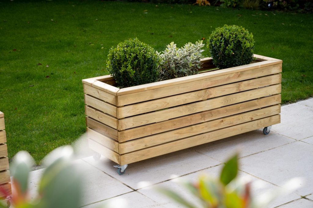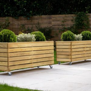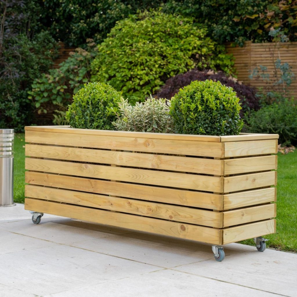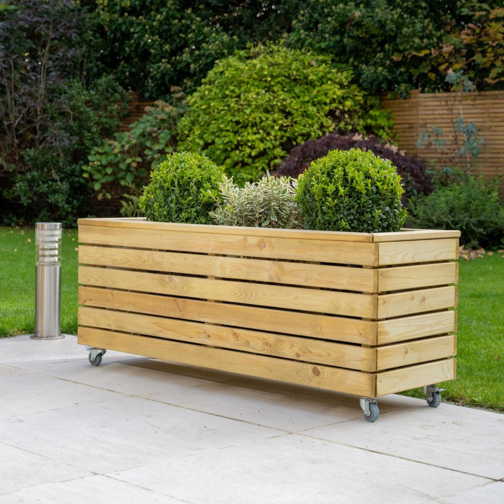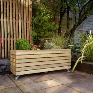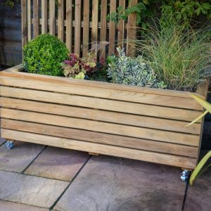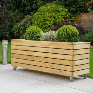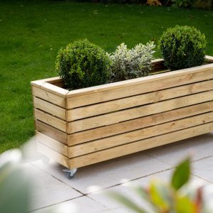 - This planter has a modern look, with strong horizontal lines and natural timber colouring, it’s sure to add interest and structure to any garden. This Linear Long Planter will add a focal point to a patio, terrace or balcony. Conveniently designed with wheels.