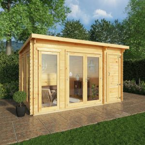 With its pent roof design, the 4.1m x 3m Studio Pent Log Cabin with Side Shed offers a sleek and contemporary design. Its sloped roof helps the building tuck away unnoticed in any garden space, whilst providing a cosy and snug inside feel.