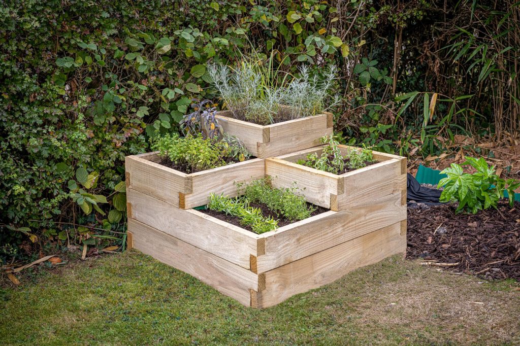 - The Caledonian Tiered Raised Bed from Forest is ideal for using as a display for plants and flowers. It could also be used as a stylish kitchen garden if you are keen to grow your own produce but don’t have the space for a full allotment. This design looks great positioned in an unused corner of your garden, it's attractive tiered design makes a great colourful display. To manufacture these planters we have used timber that has been Pressure Treated to give it a 15 year guarantee against rot and fungal decay. The Caledonian Tiered Planter can hold approximately 330L of compost to give plenty of room for a variety of plants, flowers, vegetables or herbs. This planter's frame comes pre-notched so is quick and easy to assemble. Delivered to you flat packed with easy to follow step-by-step instructions and all the fixings you need for a simple build. Other sizes and styles are also available in the Caledonian range. If using to grow food produce we recommend lining the bed/planter with a membrane before adding the soil.