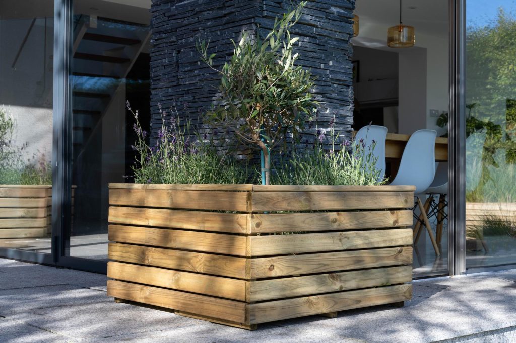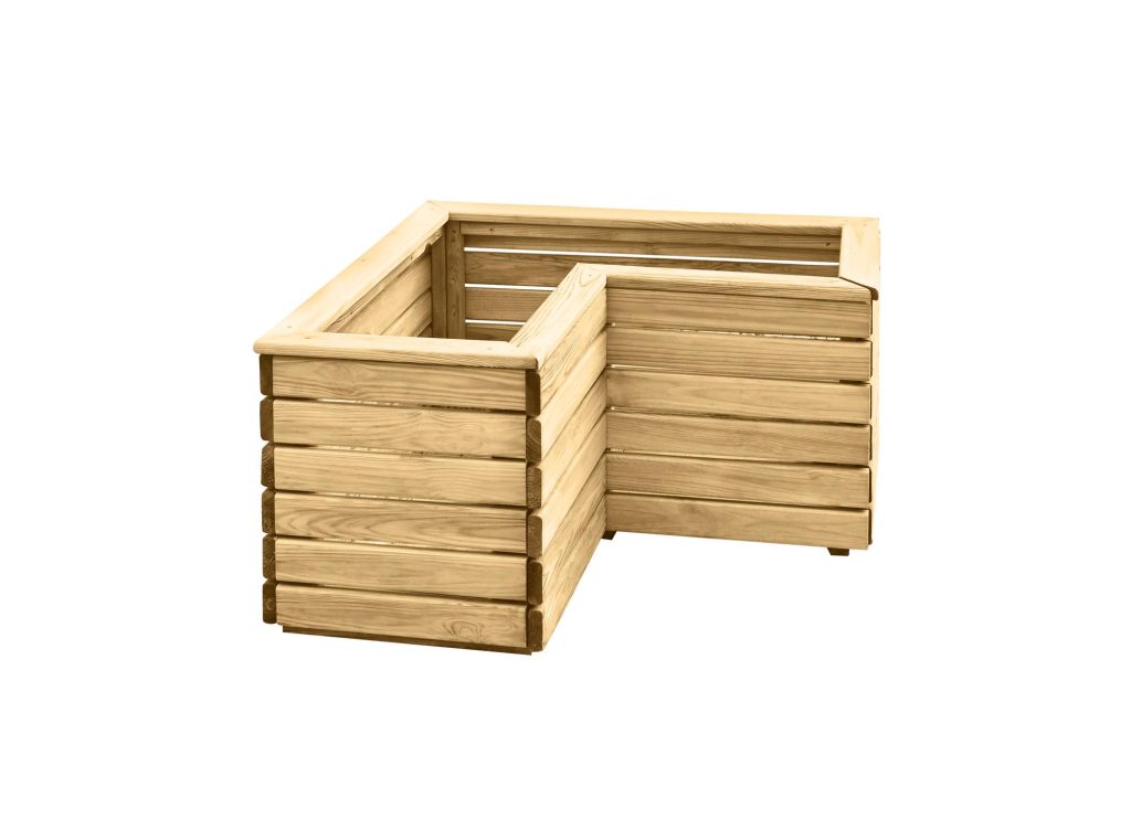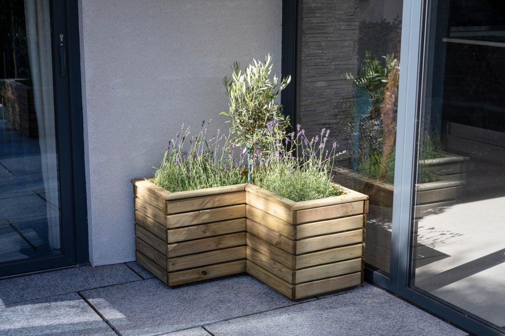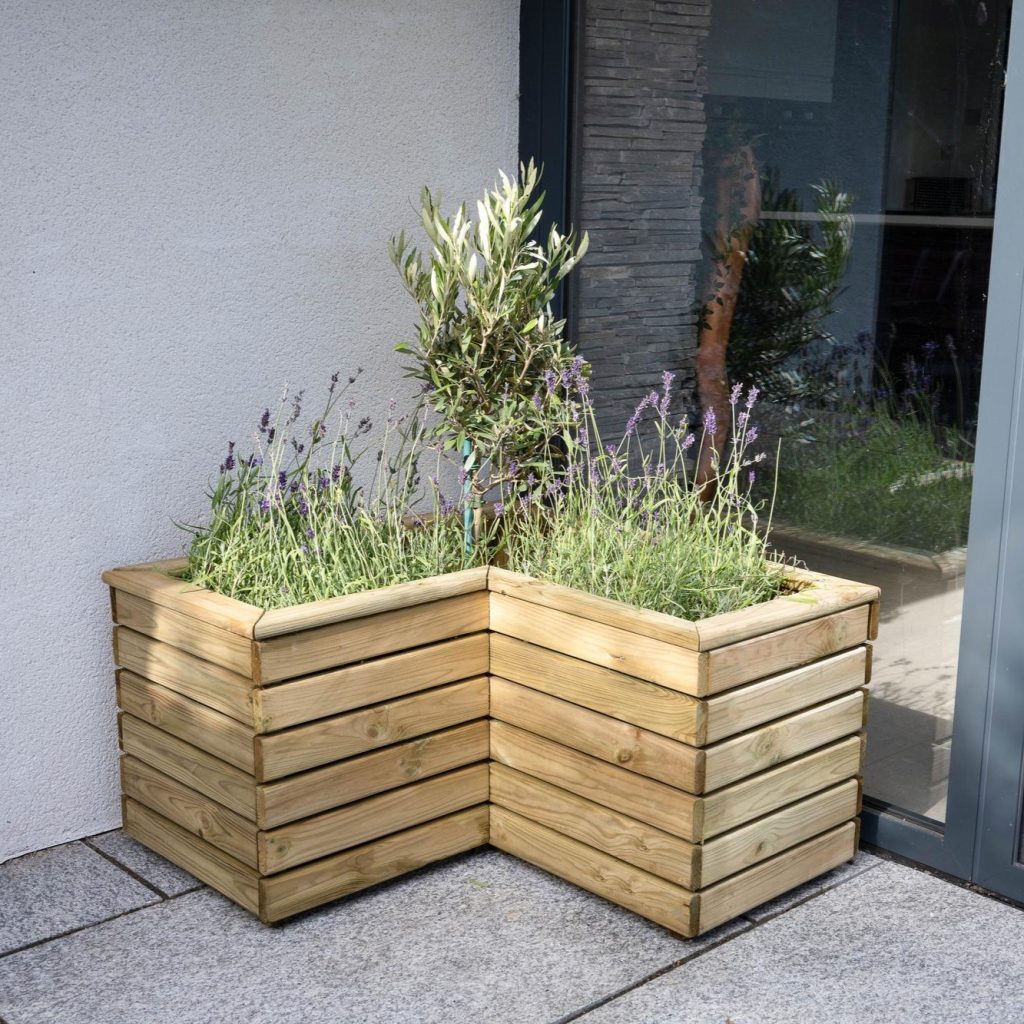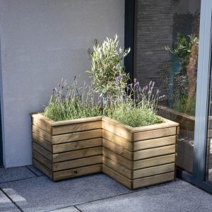 - Transform an unloved corner of your garden with our contemporary style Linear Corner Planter. Ideally sized for a variety of decorative shrubs such as box, standards, miniature firs and will look beautiful when filled with flowering plants. The planter has a modern look, with strong horizontal lines and natural timber colouring, it’s sure to add interest and structure to any garden. This Linear Corner Planter will add a focal point in any garden corner. Choose a planter – or more than one – that will suit your garden size and style from the Linear range: square, double, long and tall. For a superior finish, the timber used is smooth-planed and Pressure Treated with a preservative to protect it against rot. The planter is kept off the ground by Pressure Treated battens. The planters each come with a porous lining to keep soil and moisture in and ensure your plants thrive.