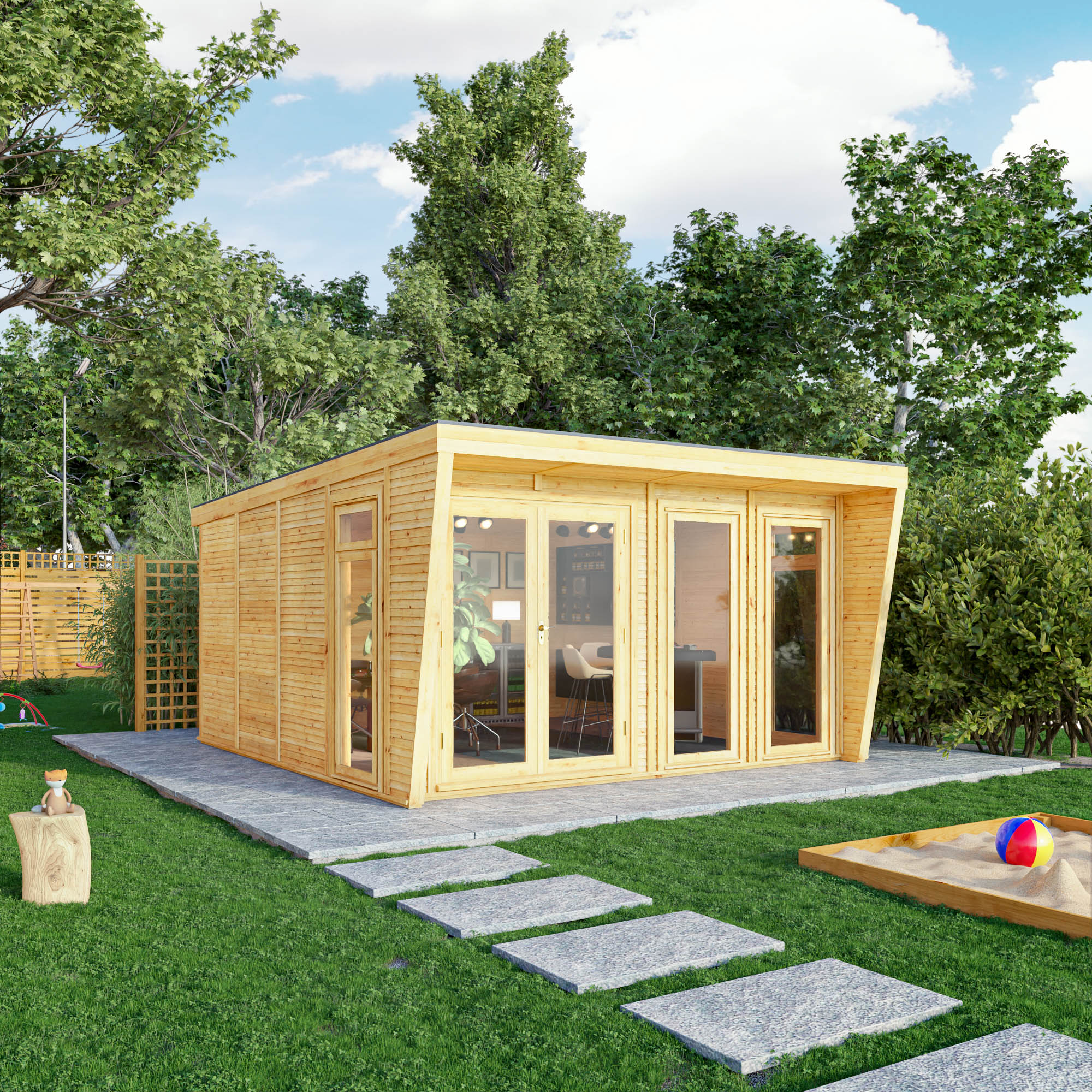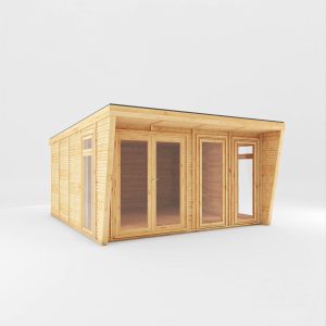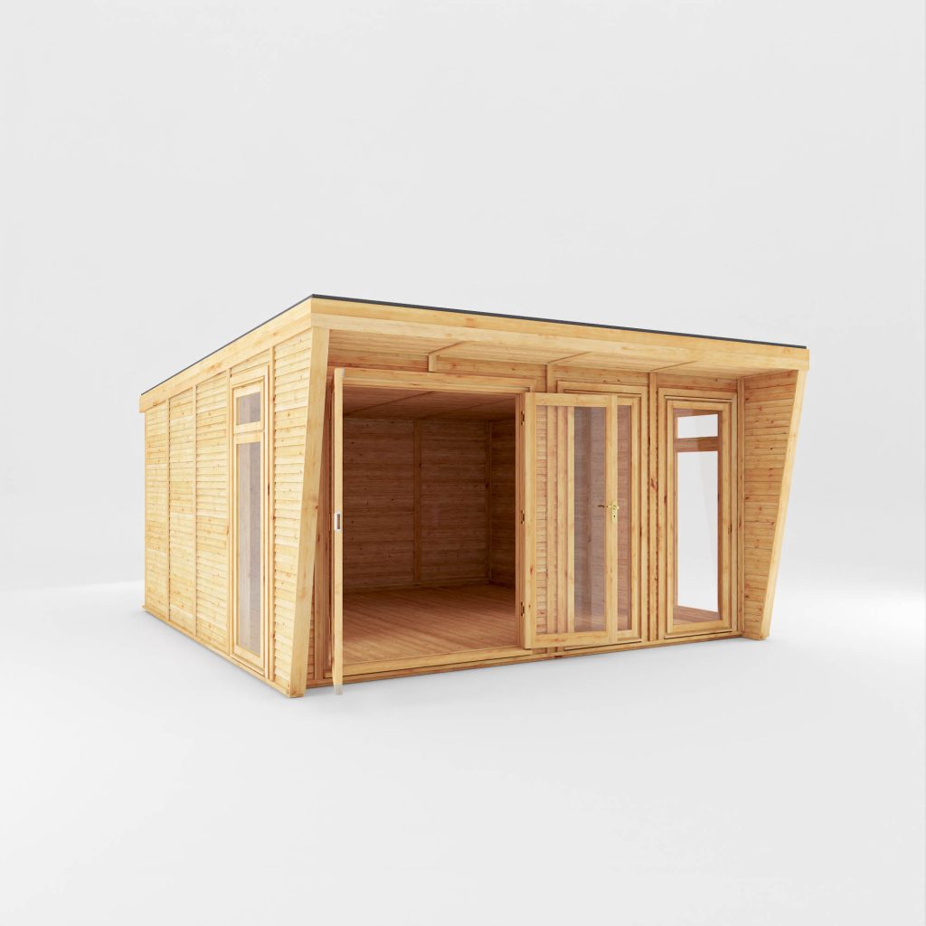This 4m x 4m garden room boasts an architecturally stunning exterior, with clean angles and a geometric shape. Our unique wing design creates an ultra-modern and stylish aesthetic, guaranteed to become a feature within your garden. The wings create a sheltered porch to the front of the building, perfect for rainy days or for added shelter in the summer. Manufactured to order here in the UK by our highly skilled team, using only the highest quality materials, you can be confident in the quality.