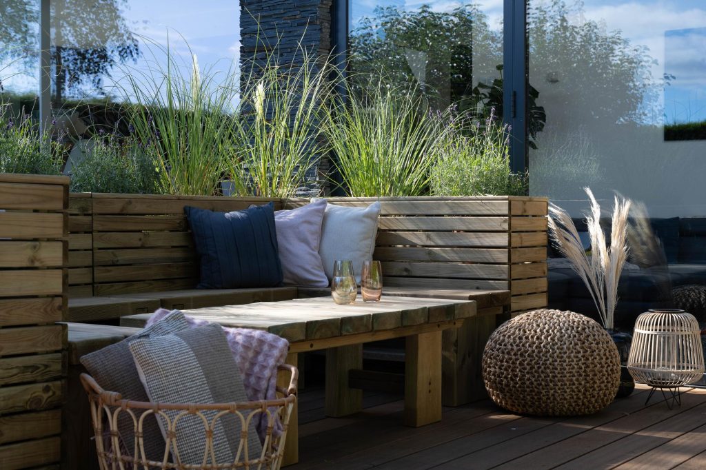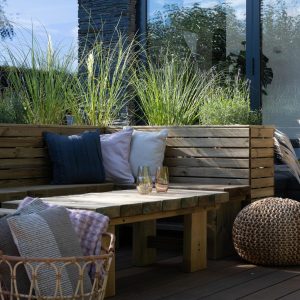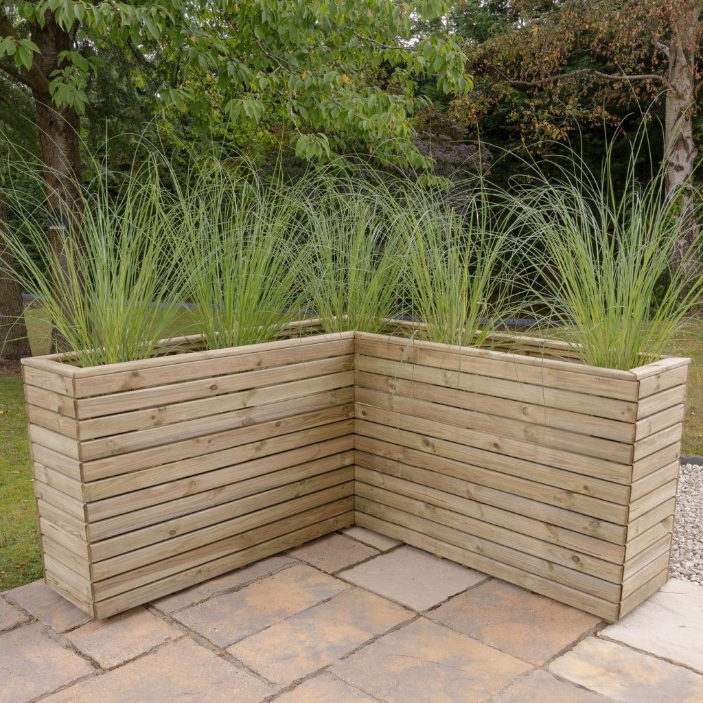 - Transform an unloved corner of your garden with our contemporary style Linear Corner Planter. Ideally sized for a variety of decorative shrubs such as box, standards, miniature firs and will look beautiful when filled with flowering plants. The planter has a modern look, with strong horizontal lines and natural timber colouring, it’s sure to add interest and structure to any garden. This Linear Corner Planter will add a focal point in any garden corner, or because of its height, is an ideal way of decoratively screening off an area of your garden. The planter can be purchased with a Double Sleeper Corner bench that is designed to fit perfectly against the planter. Choose a planter – or more than one – that will suit your garden size and style from the Linear range: square, double, long and tall. For a superior finish, the timber used is smooth-planed and Pressure Treated with a preservative to protect it against rot. The planter is kept off the ground by Pressure Treated battens. The planters each come with a porous lining to keep soil and moisture in and ensure your plants thrive.