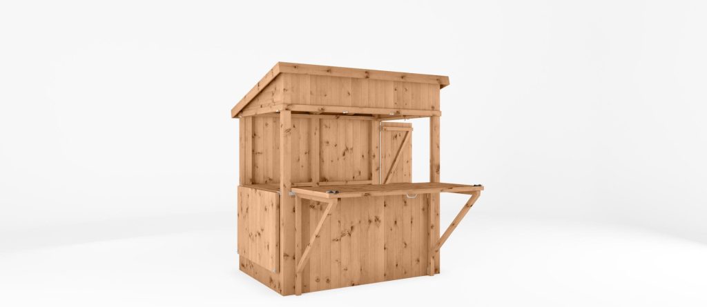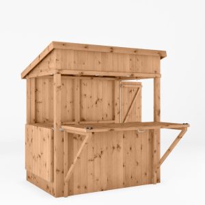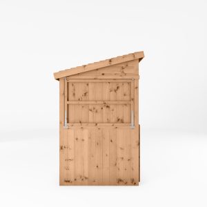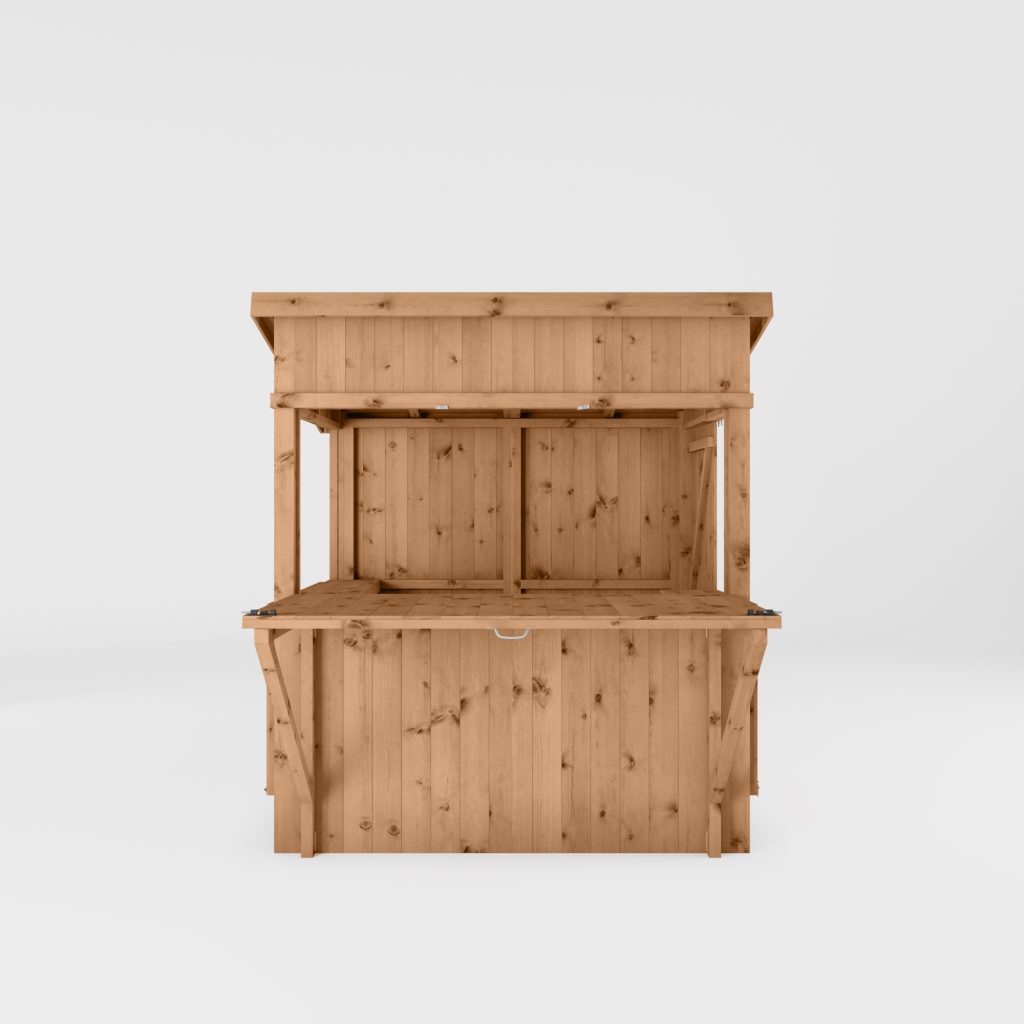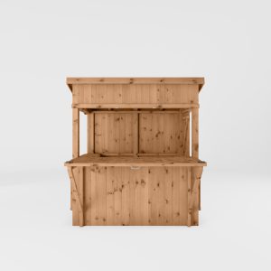 We manufacture this outdoor bar here in the UK, using pressure treated 12mm tongue and groove boards with a thick, 44mm x 44mm frame. Not only does that make for a robust, strong and long-lasting build, it looks great too! The roof is formed using overlapping timber boards that are nailed to an internal frame. Boasting a contemporary pent roof design, rainwater will simply run off the back of the building, to keep the inside of the bar dry and to avoid any water build-ups.