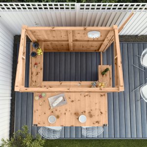 This wooden bar features side access that can be set up on either side depending on the layout of your garden, and a wooden countertop – ideal for pouring and serving drinks!