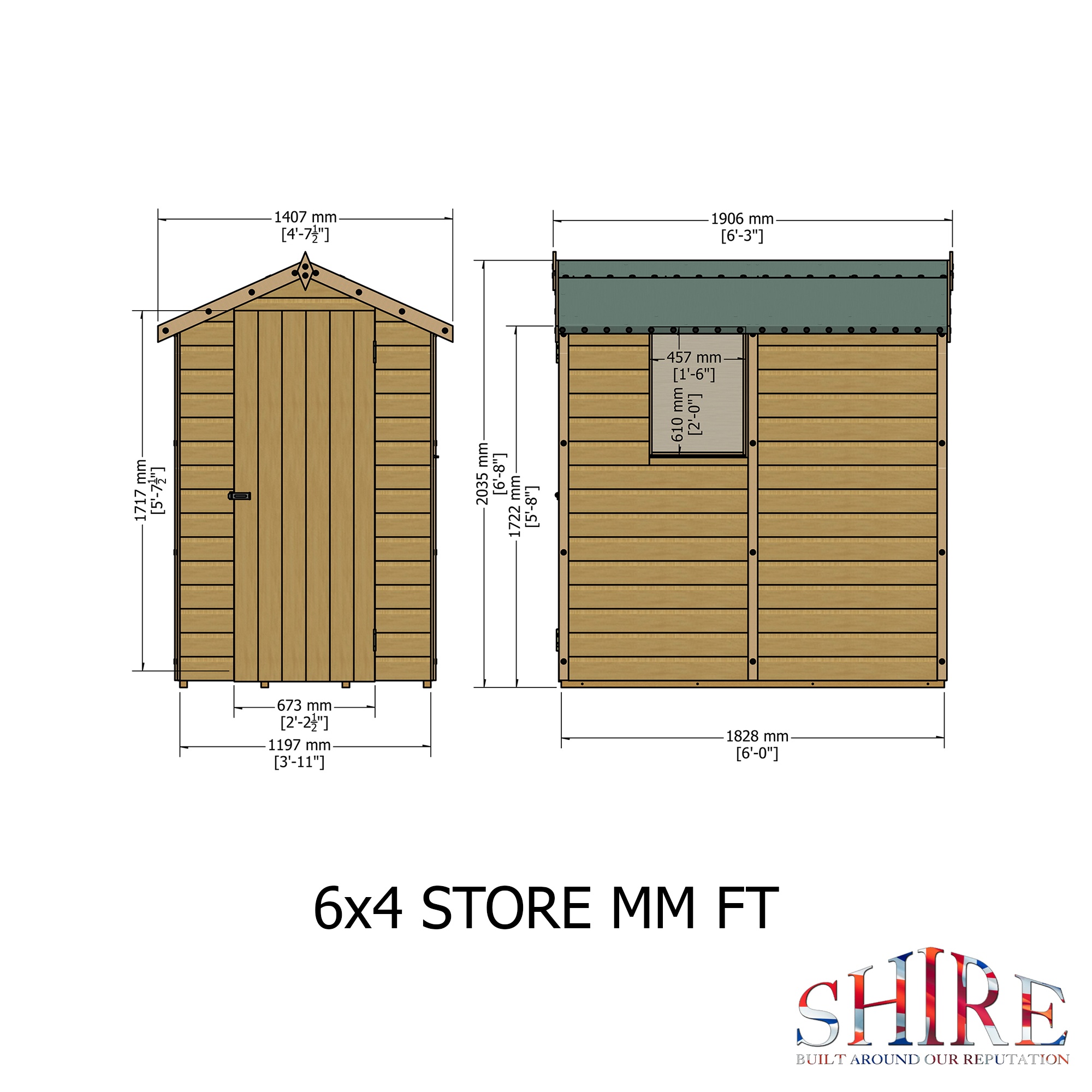 This is an attractive and well made British shed featuring high grade 12mm shiplap tongue and groove cladding and sturdy 34mm thick framing. The single door is in the 4′ gable providing easy access for bicycles or lawn mowers. There is a fixed window for added light which can go either side. The Shetland shed is ideal for storing your gardening tools or even a as a small potting shed. Both roof and floor are solid sheet OSB boards. The door is secured by a hasp and staple ready for your own padlock. The shed is pressure treated with a preservative base coat ready for your own top coat of paint or stain. Allowance should be made for the roof overhang and for access around the outside during construction and subsequent treatment.