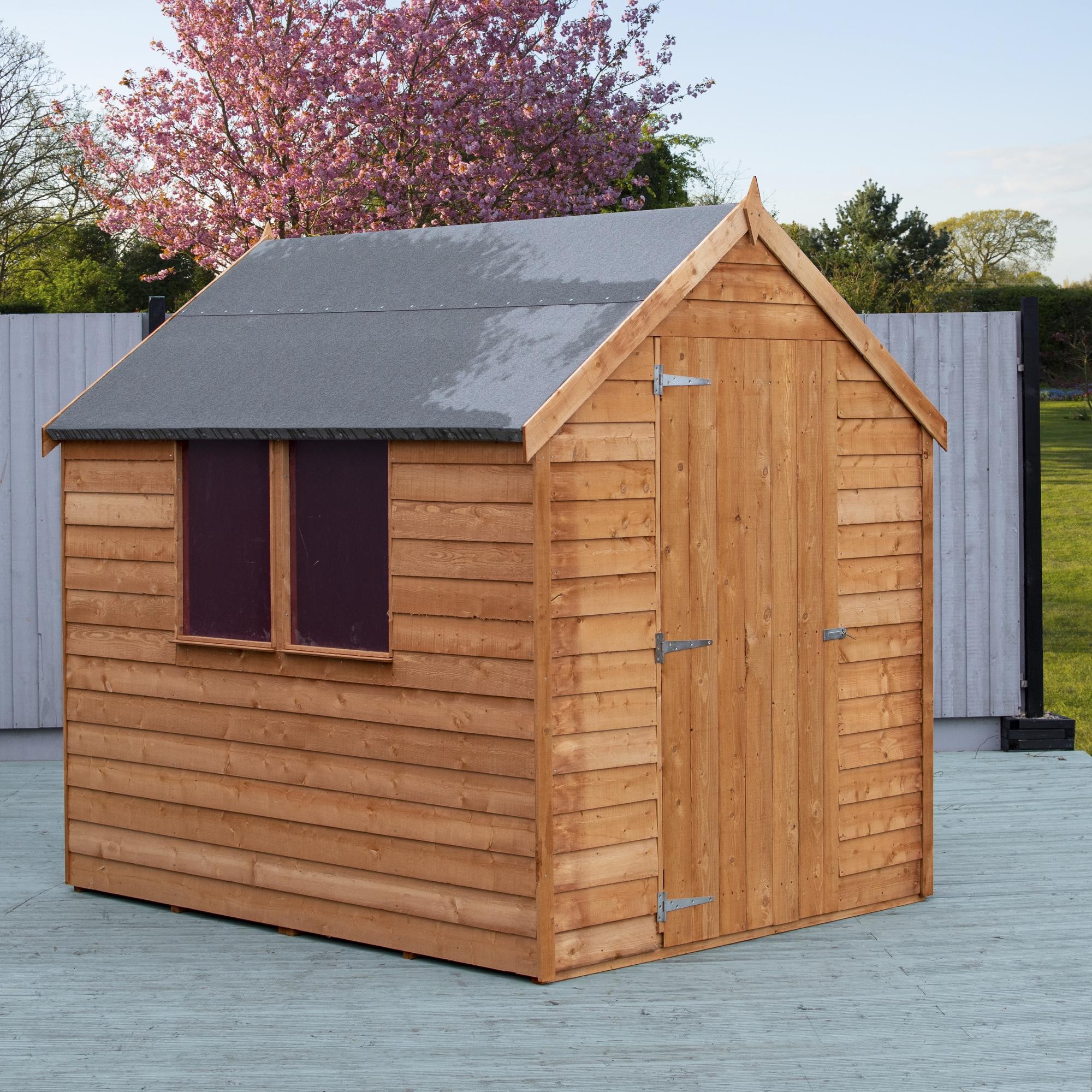 This Overlap shed range offers a great value storage space for your garden. The shed has a high roofline and a quality build setting itself apart from competition. This Garden Buildings features two fixed styrene glazed windows offering natural light to enter inside the building. The rigid 34mm square frame and high quality rustic overlap board makes the shed strong and sturdy. These quality sheds have a strong ledged single door with the roof and floor constructed of solid sheet materials giving the shed a durable structure. The Apex roof is shielded from wood rot or fungal decay by the supplied mineral roofing felt.