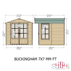 The classic Buckingham Summerhouse is a perfect choice for all gardens. The high quality double doors open out to the front and the large attractive opening Georgian side window can go on either side. It is constructed on 34mm square framing and clad with planed Shiplap tongue and groove boards made only from the highest grade, slow grown, FSC approved, northern European pine. The Summerhouse is supplied with a dip treated base coat preservative ready for you to top coat to your choice immediately on installation; this could be a paint or a stain. The window and doors are joinery made quality and of a storm resistant design. The enclosed area is approximately 7′ x 7′ with a small canopy over the front gable. (Imperial dimensions are approximate to the nearest foot; please refer to the exact metric dimensions in the data given) Allowance should be made for the roof overhang and access for painting and during installation.