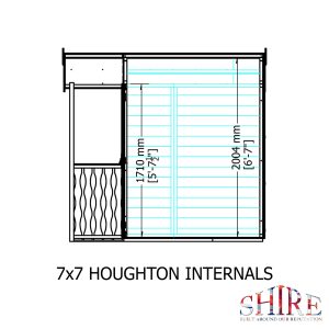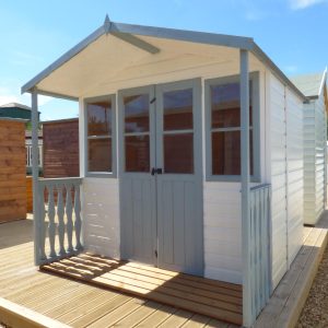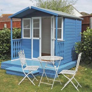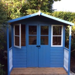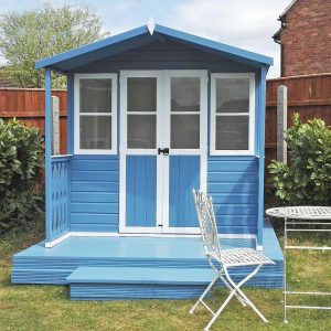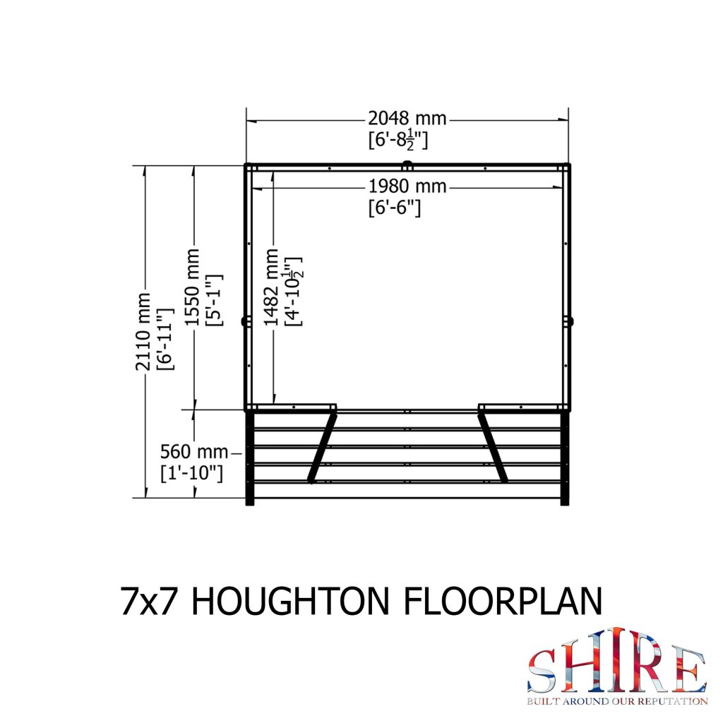 The Houghton Summerhouse is a typical British summerhouse with glazing across the width of the building and an attractive veranda. It is constructed on 34mm square framing and clad with planed Shiplap tongue and groove boards made only from the highest grade, slow grown, FSC approved, northern European pine. The Houghton is supplied with a dip treated base coat preservative ready for you to top coat immediately on installation, paint or stain whichever you prefer! The windows on either side of the doors are fixed. The enclosed area is approximately 7′ x 5′ plus a 2′ veranda making 7′ x7′ overall. (Imperial dimensions are approximate to the nearest foot, please refer to the exact metric dimensions in the data given) Allowance should be made for the roof overhang and for access around the outside during construction and subsequent treatment.