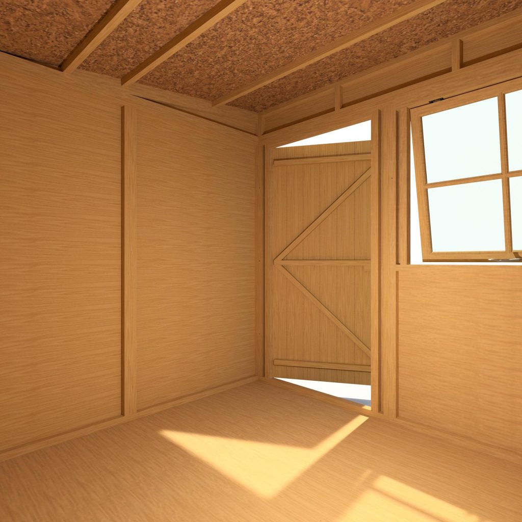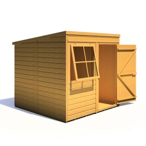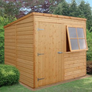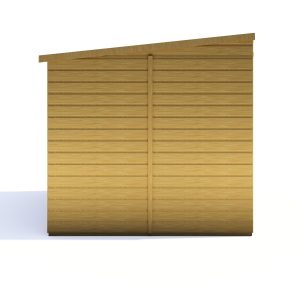 A well designed garden shed ideal for all your tools, lawn mowers, bikes, toys; the list is endless! This Pent Shed has a joinery quality storm resistant opening window to the front of the building which is interchangeable left to right with the door. Both roof and floor are manufactured from solid sheet OSB. The cladding is 12mm slow grown, very high grade FSC approved pine on 34mm square framing. Roof felt and a fixing kit are provided. It is finished with a honey brown basecoat preservative treatment ready for top coating immediately on installation to your choice of paint or stain. (Imperial measurements are rounded so please refer to the metric sizes for accuracy). Allowance should be made for the roof overhang and for access around the outside during construction and subsequent treatment.