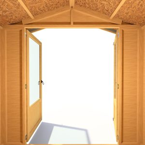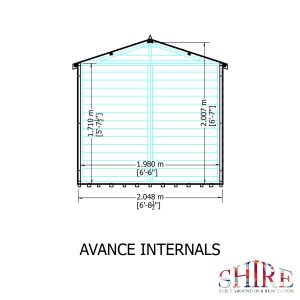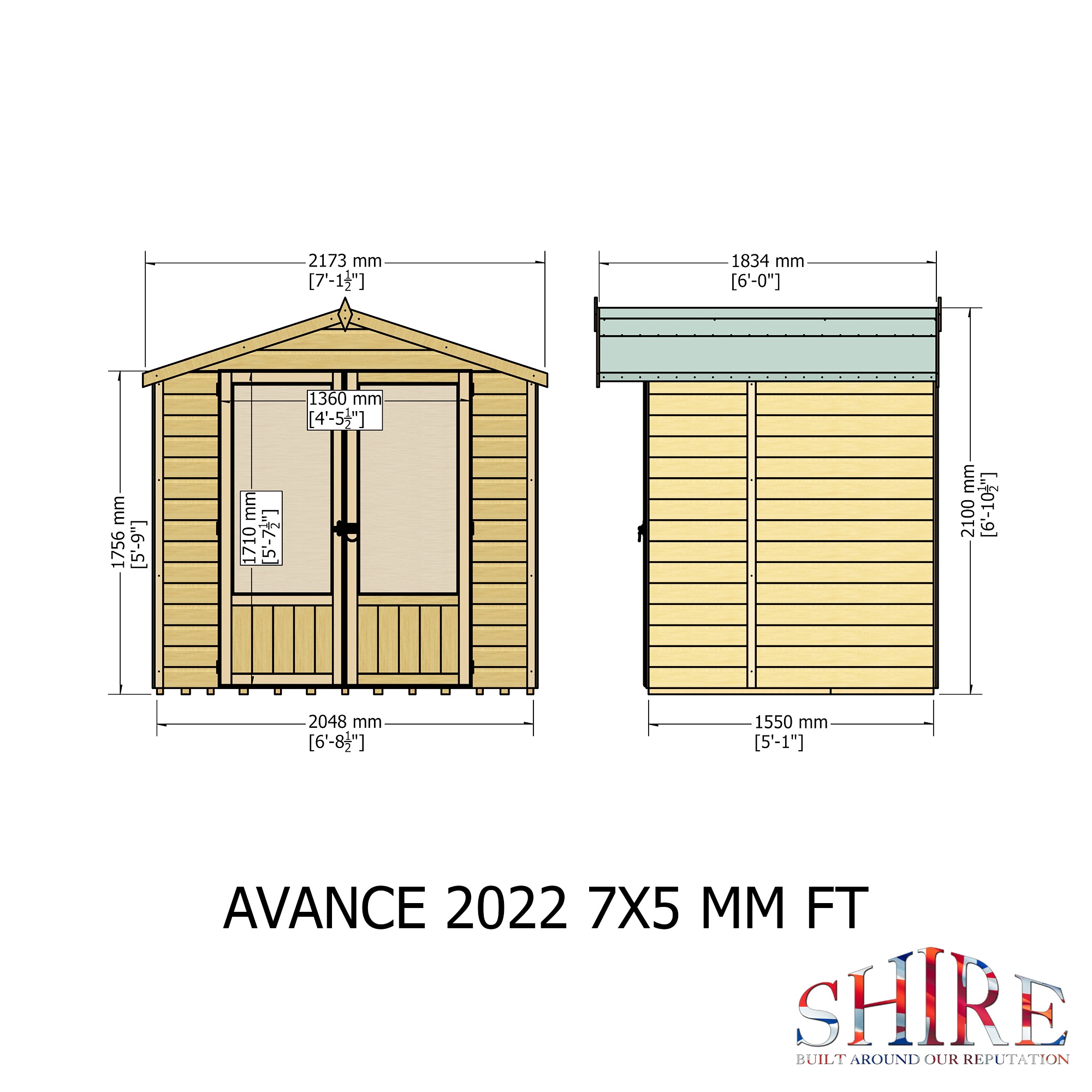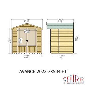 The Avance is an extremely popular summerhouse due to its styling and great price. The joinery quality, glazed doors and large canopy make an attractive addition to any garden or patio. It is constructed on sturdy 34mm square framing and clad with planed Shiplap tongue and groove boards made only from the highest grade, FSC approved, slow grown northern European pine. The floor is T&G and the roof is solid sheet OSB. The Summerhouse is treated with a dip treated base coat preservative ready for you to top coat immediately after installation. To ensure your safety the doors (set in the 7′ gable) are glazed with Perspex. (Imperial dimensions are approximate to the nearest foot, please refer to the exact metric dimensions in the data given)