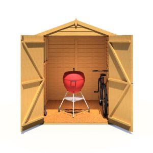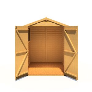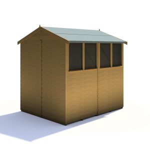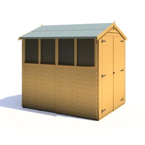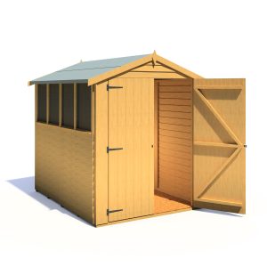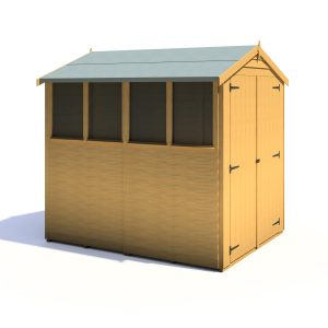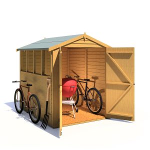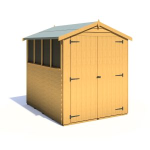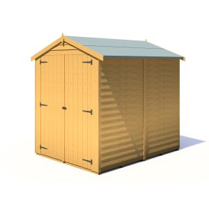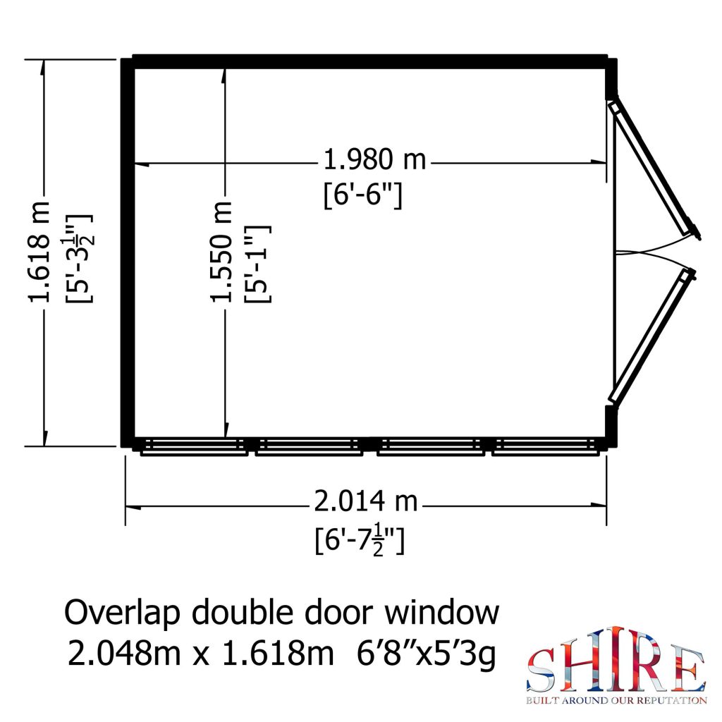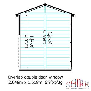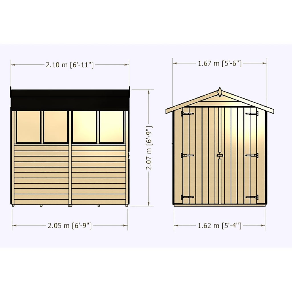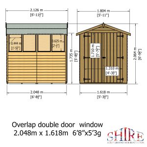 The 7′ x 5′ double door, overlap apex shed is an attractive feature in any garden. Windows down one side provide plenty of light and have safety glazing. Windows can be fitted on either side and are non-opening. The double doors in the 5′ Gable and generous eaves height allow very easy access to the entire space. It is manufactured from high grade, slow grown, FSC approved, European pine cladding boards over 34mm square framing. The doors are fitted with a hasp and staple catch ready for your own padlock. Both roof and floor are constructed from solid sheet OSB. The building is dip treated with a basecoat ready for top coating by the customer immediately on installation. All fixings, roof felt and assembly instructions are provided. (Imperial dimensions are approximate to the nearest foot, please refer to the exact metric dimensions given)