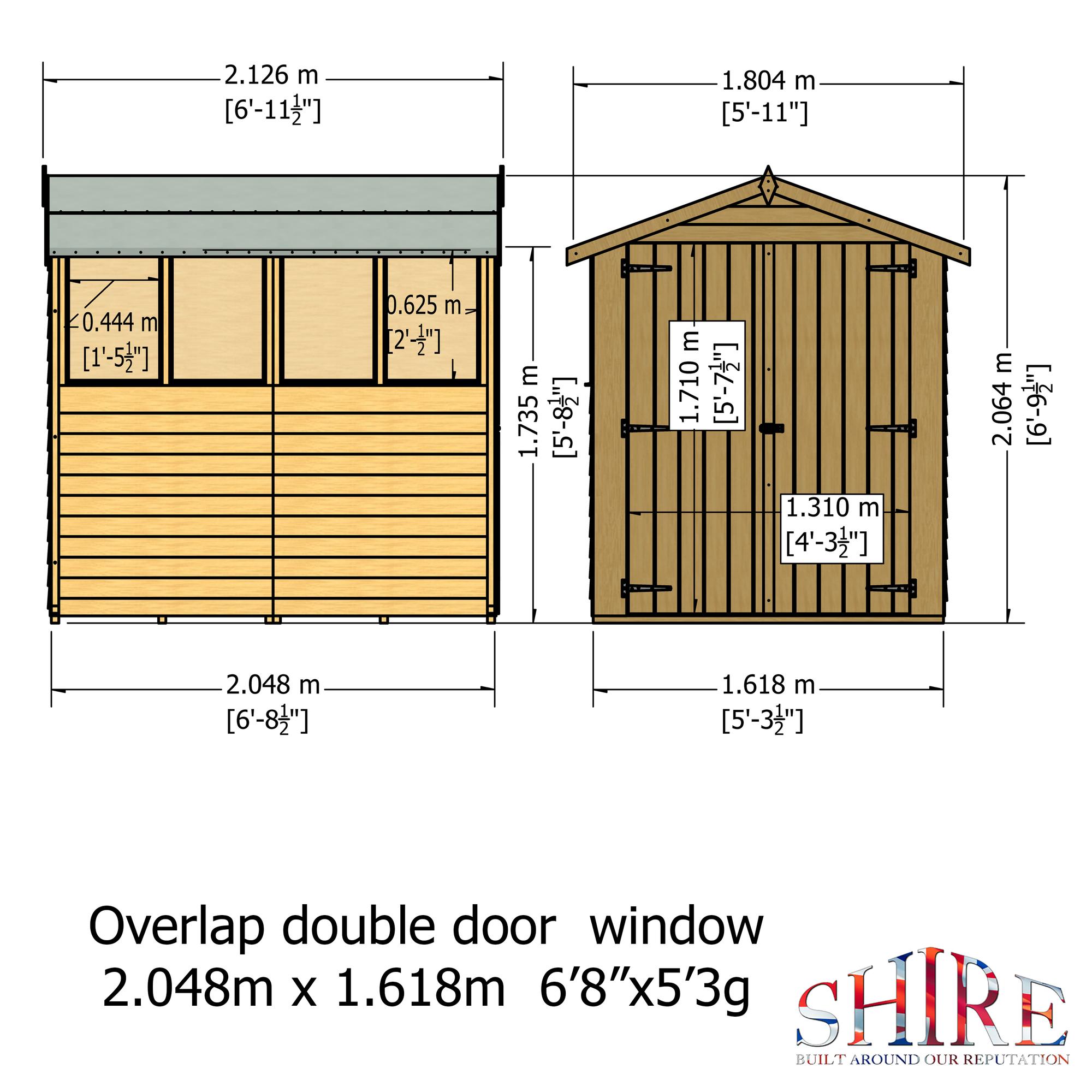 The 7′ x 5′ double door, overlap apex shed is an attractive feature in any garden. Windows down one side provide plenty of light and have safety glazing. Windows can be fitted on either side and are non-opening. The double doors in the 5′ Gable and generous eaves height allow very easy access to the entire space. It is manufactured from high grade, slow grown, FSC approved, European pine cladding boards over 34mm square framing. The doors are fitted with a hasp and staple catch ready for your own padlock. Both roof and floor are constructed from solid sheet OSB. The building is dip treated with a basecoat ready for top coating by the customer immediately on installation. All fixings, roof felt and assembly instructions are provided. (Imperial dimensions are approximate to the nearest foot, please refer to the exact metric dimensions given)