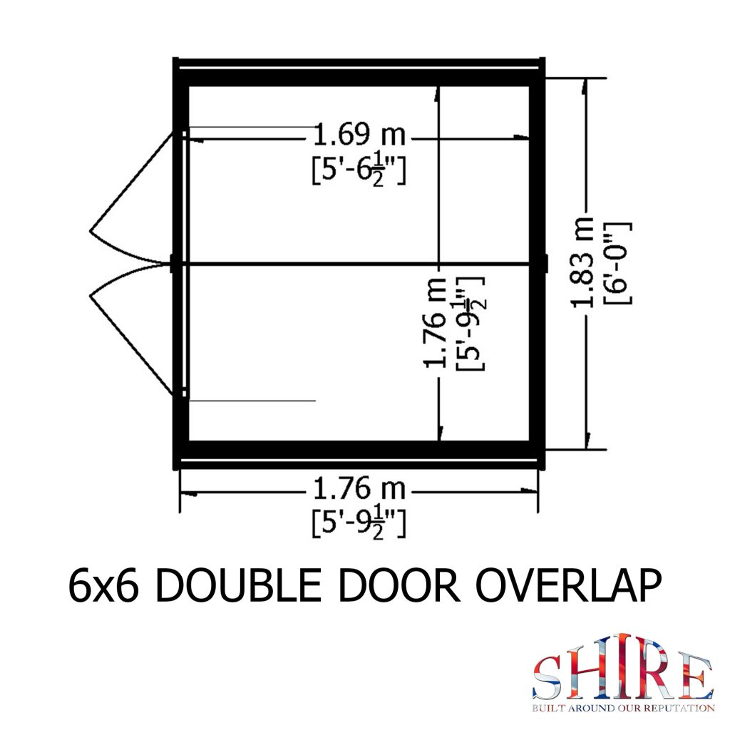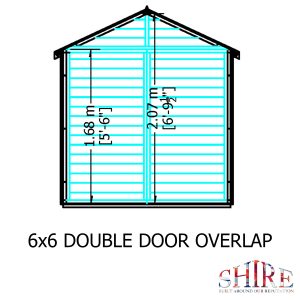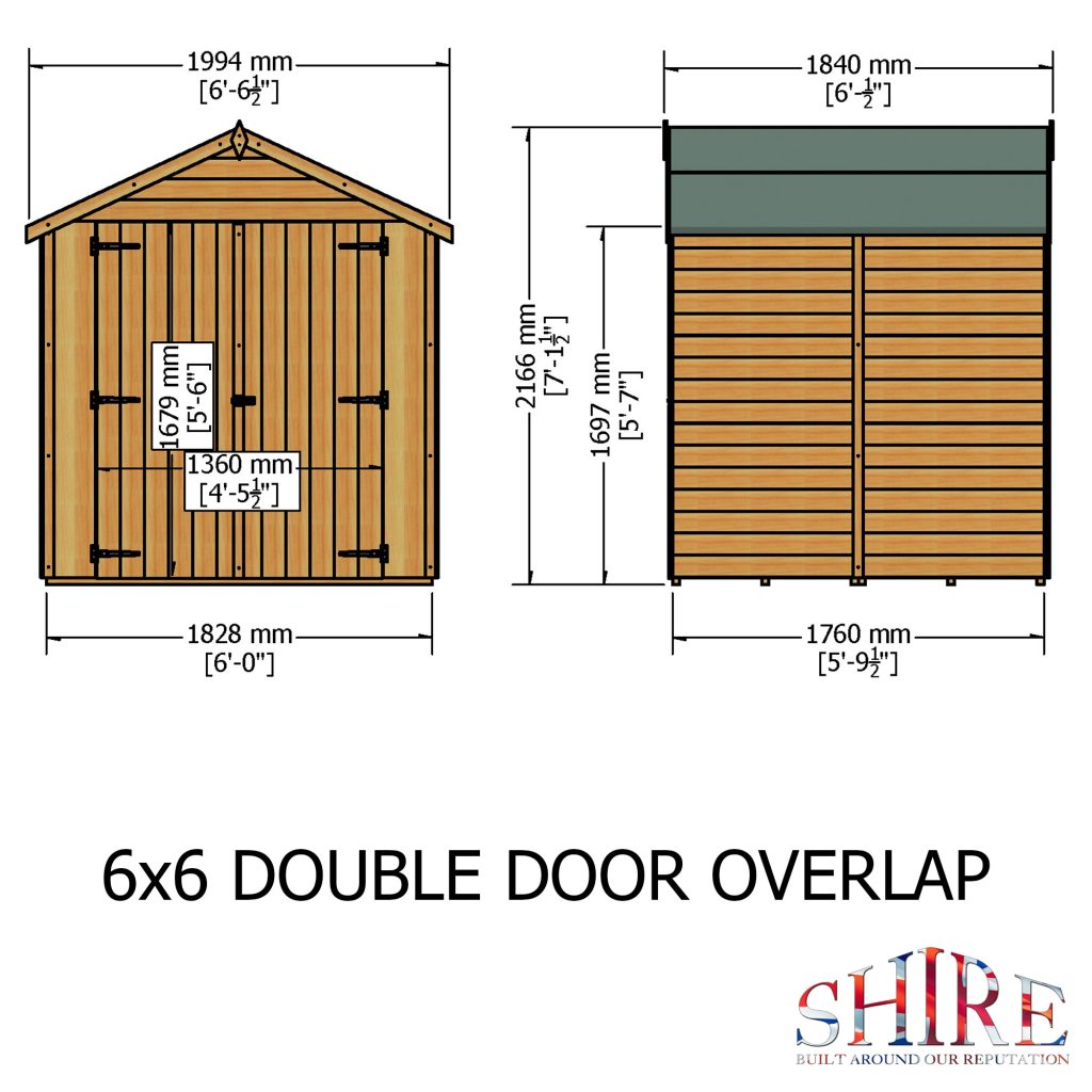 The 6′ x 6′ Overlap Double Door shed is distinguished from many of its competitors because of the wide double doors in the 6′ gable and the generous eaves height. This means that there is easy access to the entire space. It is manufactured from high grade, slow grown, FSC approved, European pine cladding boards over 34mm square framing. The doors are fitted with a hasp and staple catch ready for your own padlock. Both roof and floor are constructed from solid sheet OSB. There are no windows in this model. The building is dip treated with a basecoat ready for top coating by the customer immediately on installation. All fixings, roof felt and assembly instructions are provided. (Imperial dimensions are approximate to the nearest foot, please refer to the exact metric dimensions given)