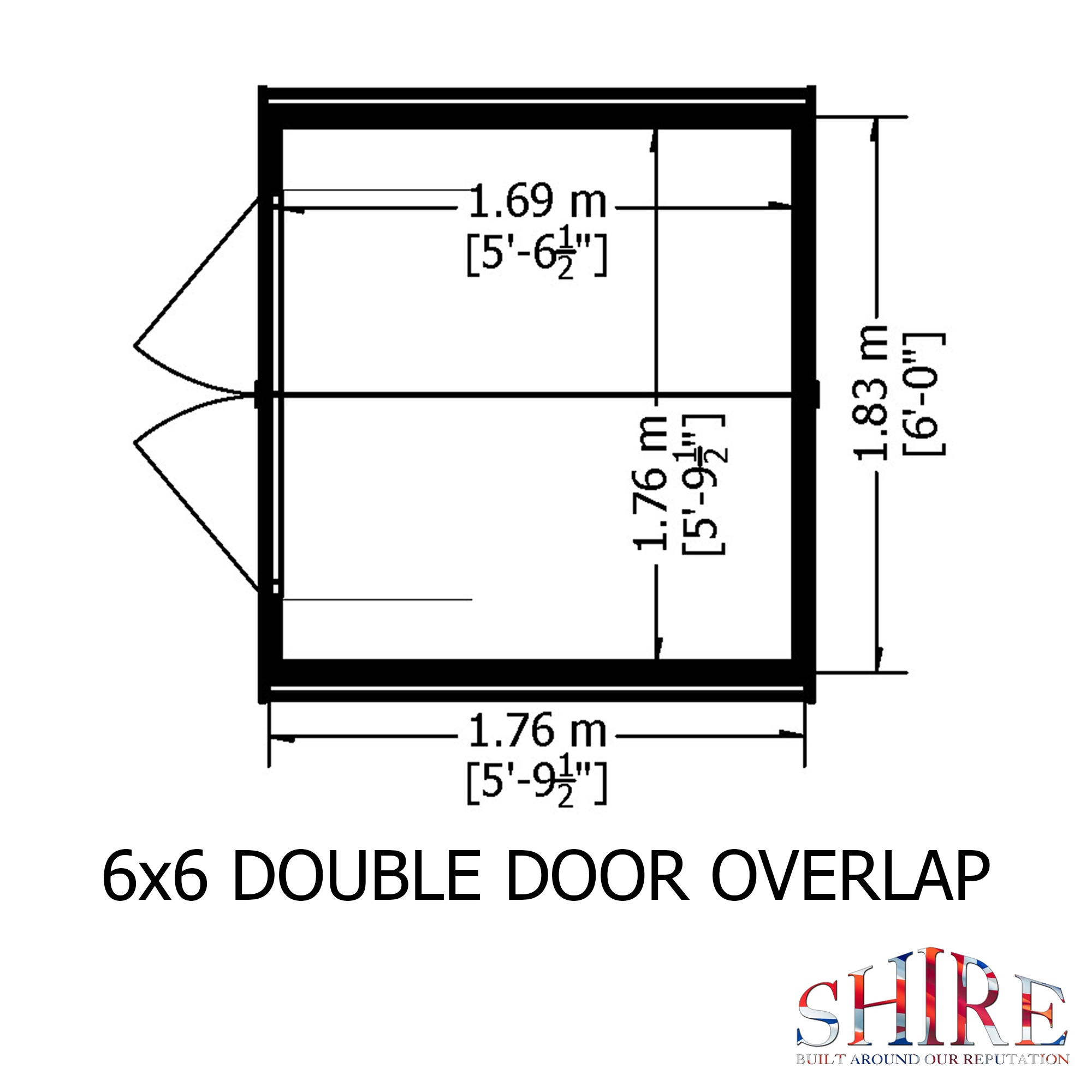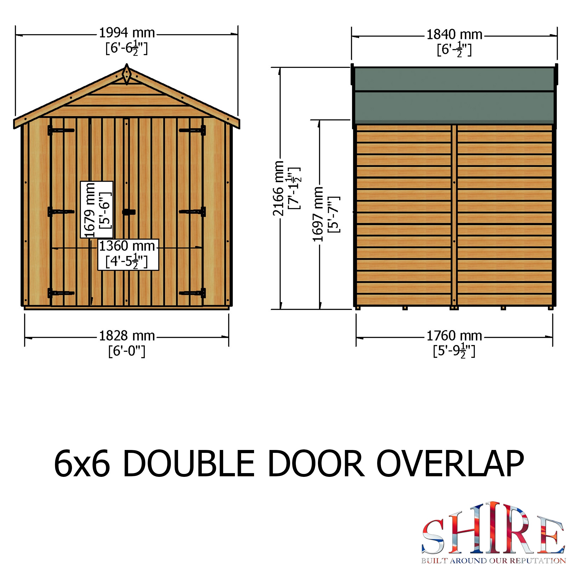 The 6′ x 6′ Overlap Double Door shed is distinguished from many of its competitors because of the wide double doors in the 6′ gable and the generous eaves height. This means that there is easy access to the entire space. It is manufactured from high grade, slow grown, FSC approved, European pine cladding boards over 34mm square framing. The doors are fitted with a hasp and staple catch ready for your own padlock. Both roof and floor are constructed from solid sheet OSB. There are no windows in this model. The building is dip treated with a basecoat ready for top coating by the customer immediately on installation. All fixings, roof felt and assembly instructions are provided. (Imperial dimensions are approximate to the nearest foot, please refer to the exact metric dimensions given)