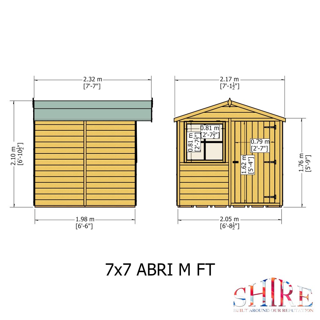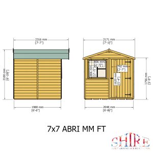 The Abri is a stylish British made shed, manufactured from high grade FSC approved timber featuring high grade 12mm shiplap tongue and groove cladding and strong 34mm square framing. With a generous eaves height, the Abri 7×7 offers ideal storage space for equipment, tools and furniture. The opening joinery made window is storm resistant and the building benefits from tongue and groove timber flooring with a solid sheet roof. The shed is dip treated with a preservative base coat ready for your own topcoat of paint or stain. Allowance should be made for the roof overhang and for access around the outside during construction and subsequent treatment. For critical dimensions use the metric values; imperial dimensions are rounded for description only.