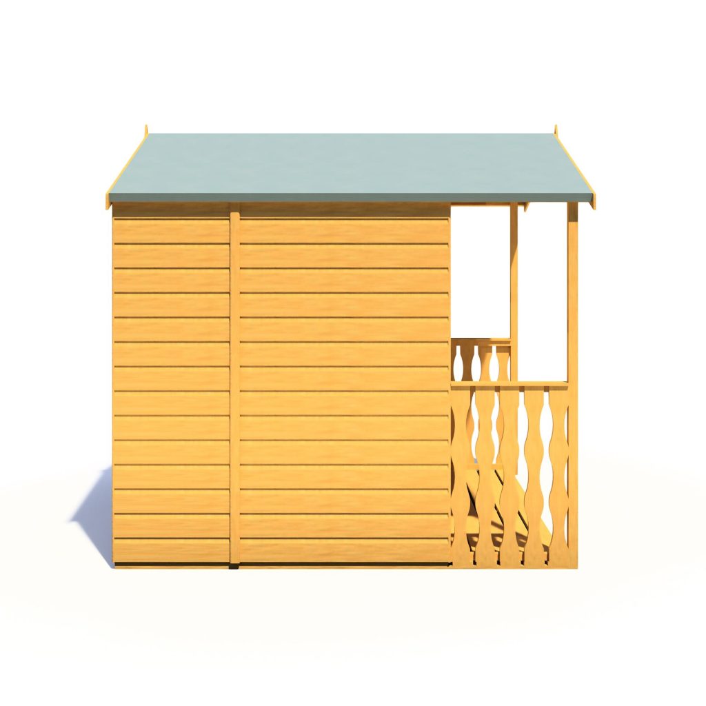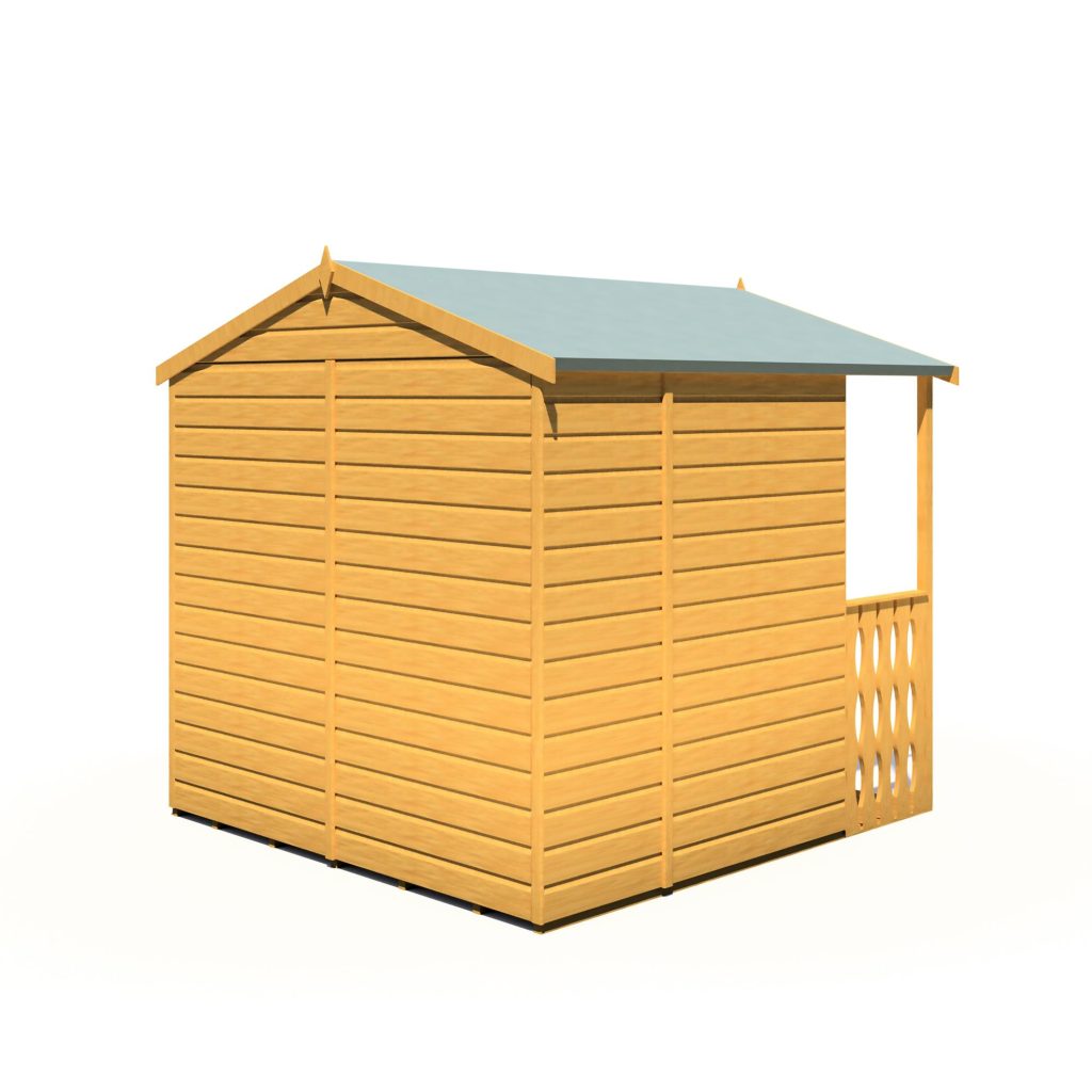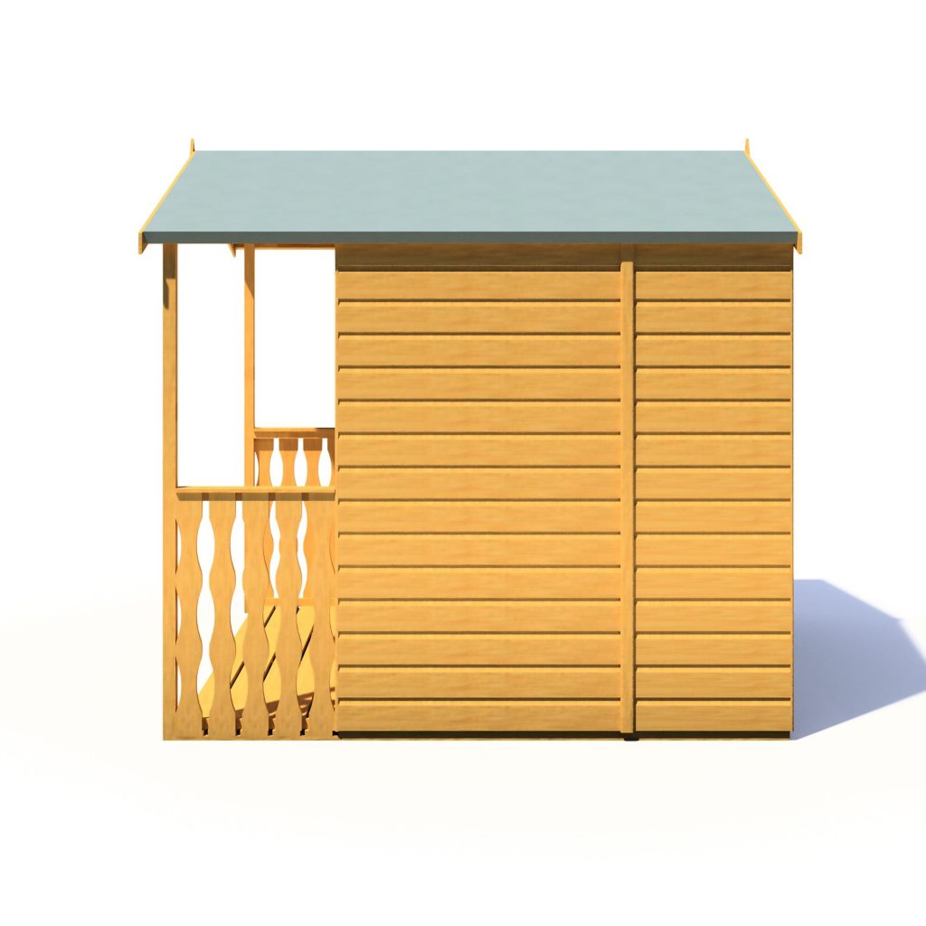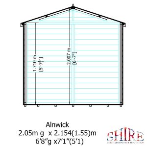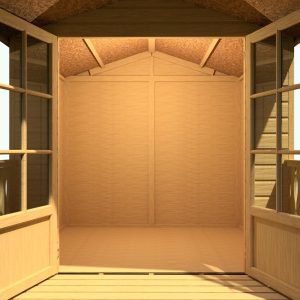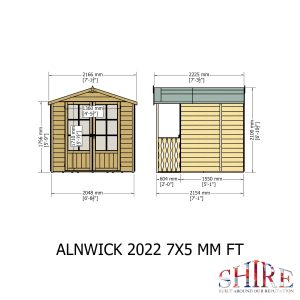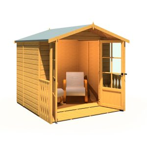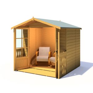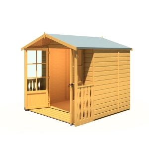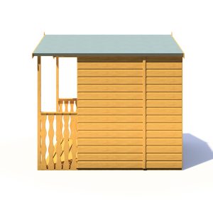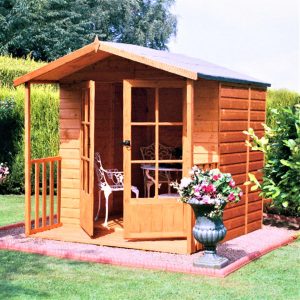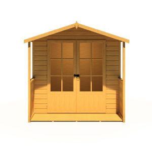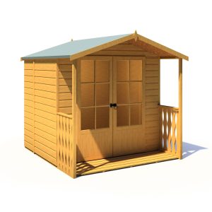 The Alnwick comes complete with an attractive verandah and Georgian glazing to the joinery quality doors, creating a very pretty summerhouse. There is a large canopy over the veranda which adds to its appeal. Imagine relaxing peacefully in your summerhouse on a summer’s evening! It is constructed on 34mm square framing and clad with planed Shiplap tongue and groove boards made only from the highest grade, FSC approved, slow grown northern European pine. The floor is T&G boards and the roof is solid sheet OSB boards, with green mineral felt supplied for the exterior. The Summerhouse is supplied with a dip treated base coat preservative ready for you to top coat in your own choice of colour immediately after installation. To ensure your safety the doors (set in the 7′ gable) are glazed with Perspex. (Imperial dimensions are approximate to the nearest foot, please refer to the exact metric dimensions in the data given)