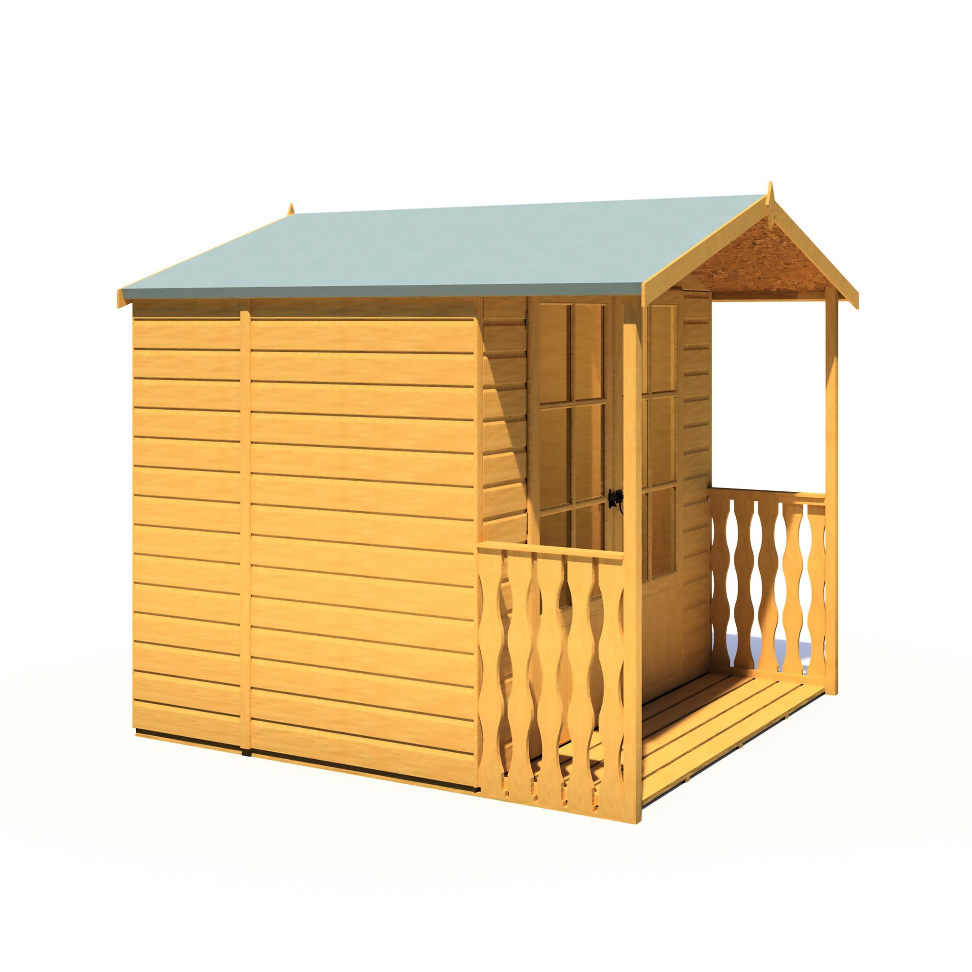 The Alnwick comes complete with an attractive verandah and Georgian glazing to the joinery quality doors, creating a very pretty summerhouse. There is a large canopy over the veranda which adds to its appeal. Imagine relaxing peacefully in your summerhouse on a summer’s evening! It is constructed on 34mm square framing and clad with planed Shiplap tongue and groove boards made only from the highest grade, FSC approved, slow grown northern European pine. The floor is T&G boards and the roof is solid sheet OSB boards, with green mineral felt supplied for the exterior. The Summerhouse is supplied with a dip treated base coat preservative ready for you to top coat in your own choice of colour immediately after installation. To ensure your safety the doors (set in the 7′ gable) are glazed with Perspex. (Imperial dimensions are approximate to the nearest foot, please refer to the exact metric dimensions in the data given)
