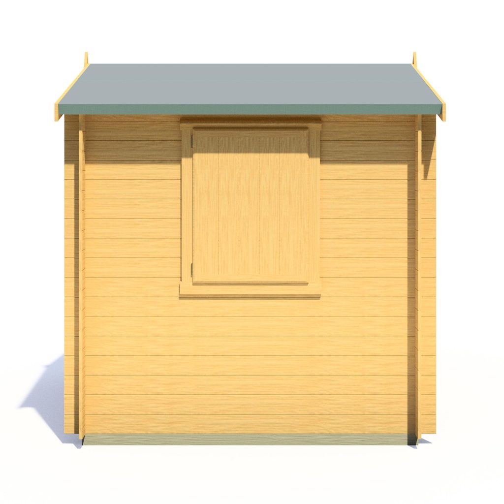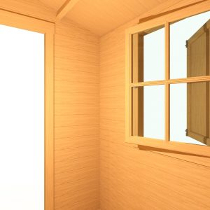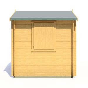 A robust log cabin style garden shed or workshop with a fully framed single door, a joinery quality opening window complete with shutter. Tongue and groove roof and floor with pressure treated bearers. Door is fully framed and features a full length piano style hinge to improve security. The side hung opening window is a joinery standard, storm resistant design. The interlocking timbers that make up the walls of the building are 19mm thick some 50% thicker than a normal garden shed; roof and floor are 12mm thick. Where dimensions are critical please check internal (Floor) sizes as Log cabins are sized to the edge of the individual boards. Internal eaves height is a full 6′ (1825mm) The building is manufactured here in the UK and all of the wood used is high grade, FSC approved Northern European Pine. The floor is included in the price.
