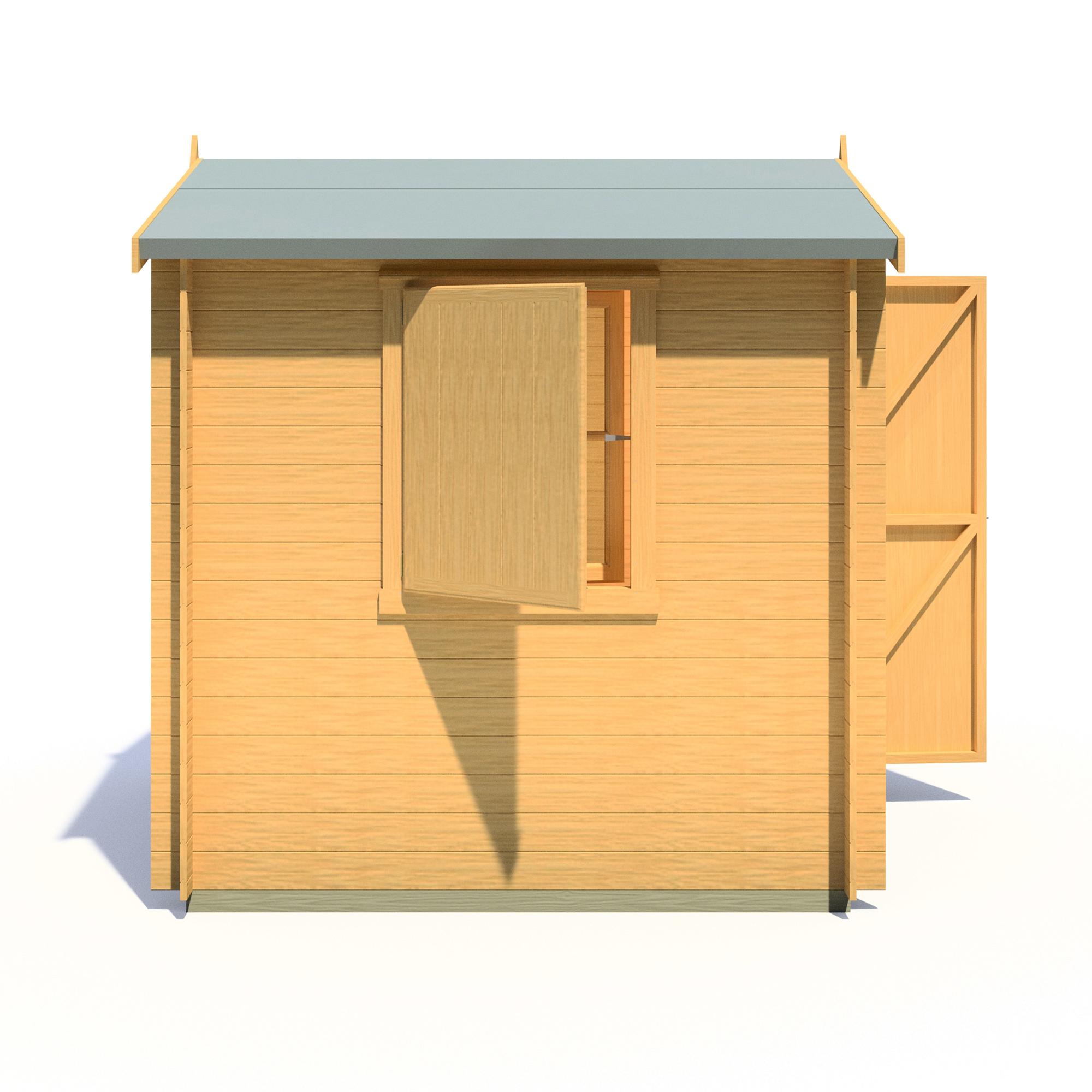 A robust log cabin style garden shed or workshop with a fully framed single door, a joinery quality opening window complete with shutter. Tongue and groove roof and floor with pressure treated bearers. Door is fully framed and features a full length piano style hinge to improve security. The side hung opening window is a joinery standard, storm resistant design. The interlocking timbers that make up the walls of the building are 19mm thick some 50% thicker than a normal garden shed; roof and floor are 12mm thick. Where dimensions are critical please check internal (Floor) sizes as Log cabins are sized to the edge of the individual boards. Internal eaves height is a full 6′ (1825mm) The building is manufactured here in the UK and all of the wood used is high grade, FSC approved Northern European Pine. The floor is included in the price.