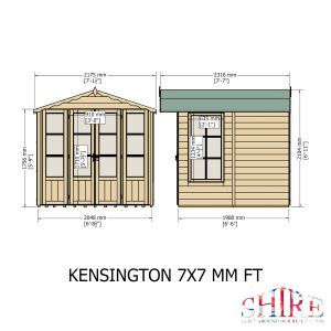 The classic Kensington Summerhouse is a perfect choice for all gardens with its attractive design and practicality . The high quality double doors open out to the front and the large attractive opening side window can go on either side. It is constructed on 34mm square framing and clad with planed Shiplap tongue and groove boards made only from the highest grade, slow grown, FSC approved, northern European pine. The Summerhouse is supplied with a dip treated base coat preservative ready for you to top coat to your choice immediately on installation; this could be a paint or a stain. The window and doors are joinery made quality and of a storm resistant design. The roof and floor are both constructed using T&G boards. The enclosed area is approximately 7′ x 7′ with a small canopy over the front gable. (Imperial dimensions are approximate to the nearest foot; please refer to the exact metric dimensions in the data given) Allowance should be made for the roof overhang and access for painting and during installation.