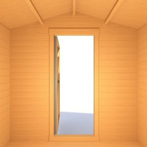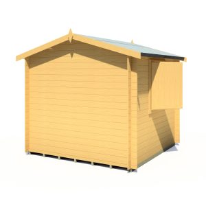 A robust log cabin style garden shed or workshop with a fully framed single door, a joinery quality opening window complete with shutter. Tongue and groove roof and floor with pressure treated bearers. Door is fully framed and features a full length piano style hinge to improve security. The side hung opening window is a joinery standard, storm resistant design. The interlocking timbers that make up the walls of the building are 19mm thick some 50% thicker than a normal garden shed; roof and floor are 12mm thick. Where dimensions are critical please check internal (Floor) sizes as Log cabins are sized to the edge of the individual boards. Internal eaves height is a full 6′ (1825mm) The building is manufactured here in the UK and all of the wood used is high grade, FSC approved Northern European Pine. The floor is included in the price.