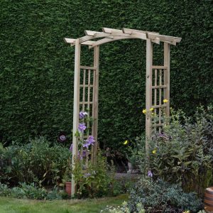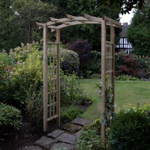 The curved top of this wooden arch has a much-loved pergola construction. The rectangular trellis is reminiscent of the East and ideal for training your climbing plants.