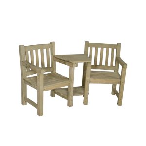 - The Harvington Love Seat from the Forest is a beautifully designed piece of furniture that will enhance any garden. Spend some time in the company of a friend or loved one whilst taking in the view. With a built in table, it's the perfect place to sit and enjoy a drink. For a superior build, the bench has been manufactured from Pressure Treated timber, which comes with a 15 year guarantee against rot and fungal decay. It's crafted from smooth-planed timber for a comfortable and splinter free finish. Delivered flat packed for easy self-assembly, fixings and instructions included.